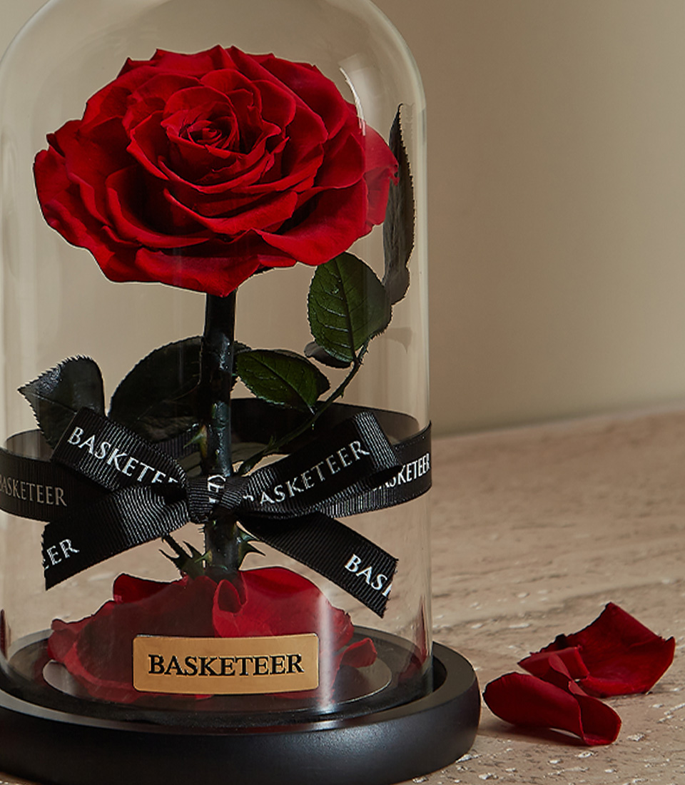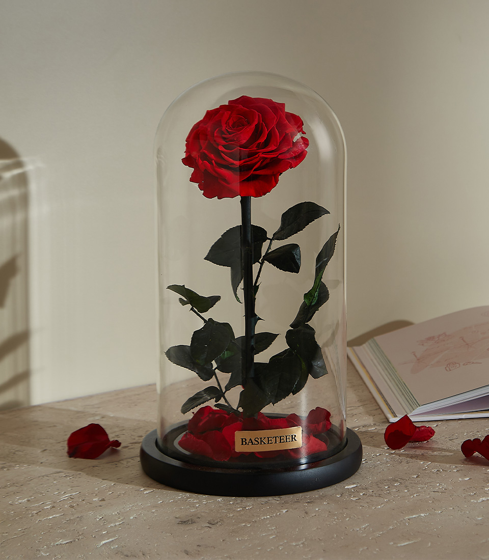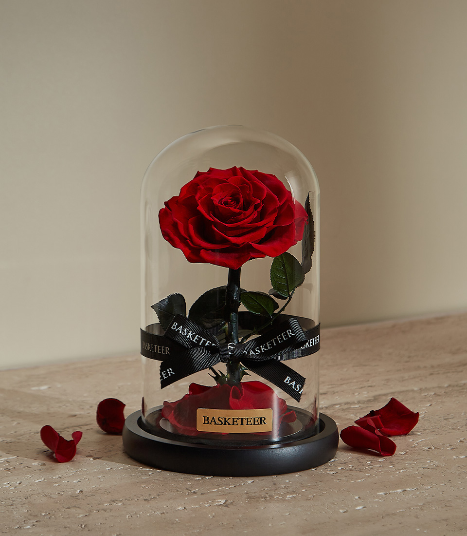 Preserved Red Rose in Glass Dome Inspired by fairy-tale romance, the Eternal Enchantment features a stunning preserved red rose encased in a crystal-clear glass dome. Its delicate beauty is enhanced by scattered rose petals at the base, making it a luxurious symbol of love and devotion.