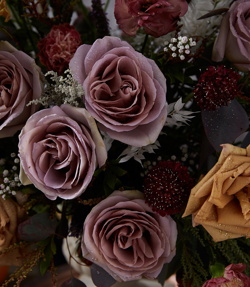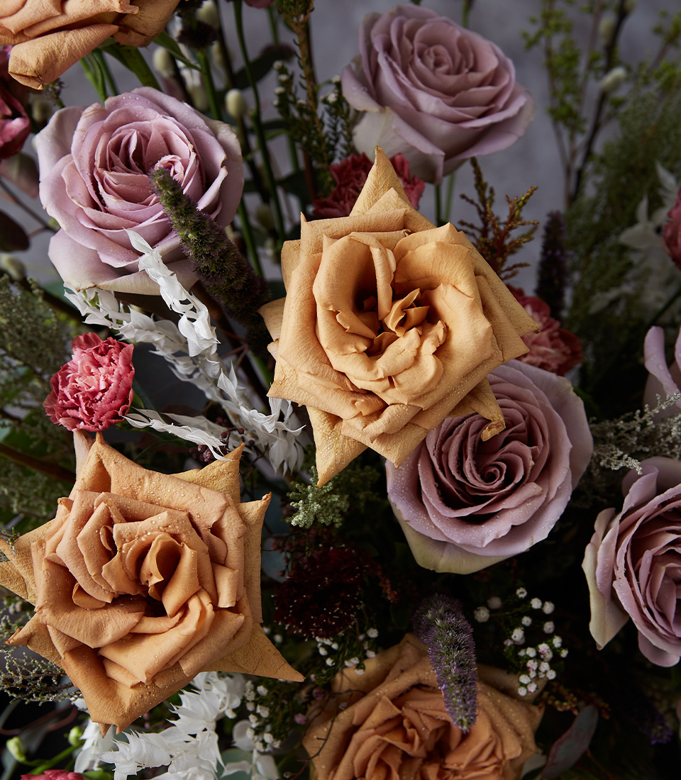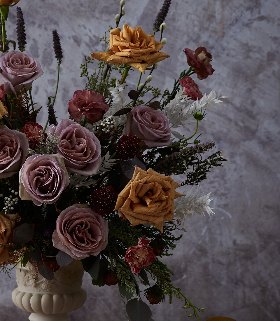 Elevate any space with sophisticated mocha and lavender roses in a tall vase—perfect for elegant interiors or meaningful gifting moments.