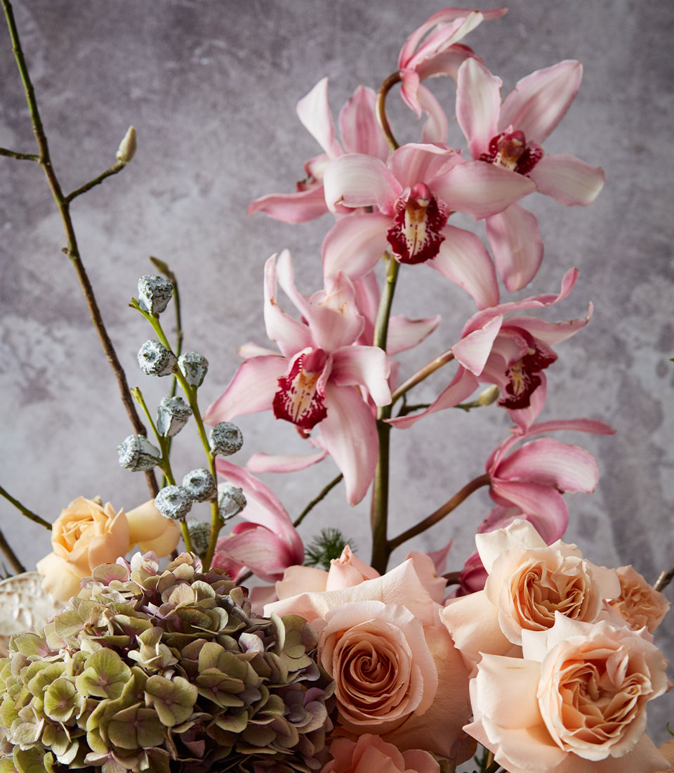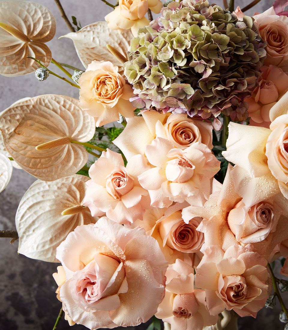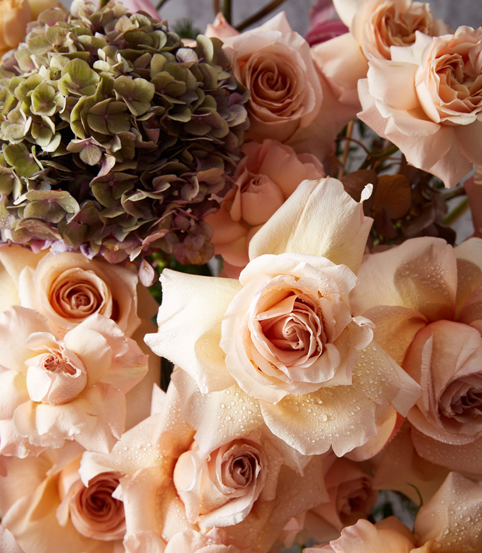Delicate peach roses, orchids, and hydrangeas arranged in a vintage vase—ideal for romantic gifts or adding timeless charm to any space.