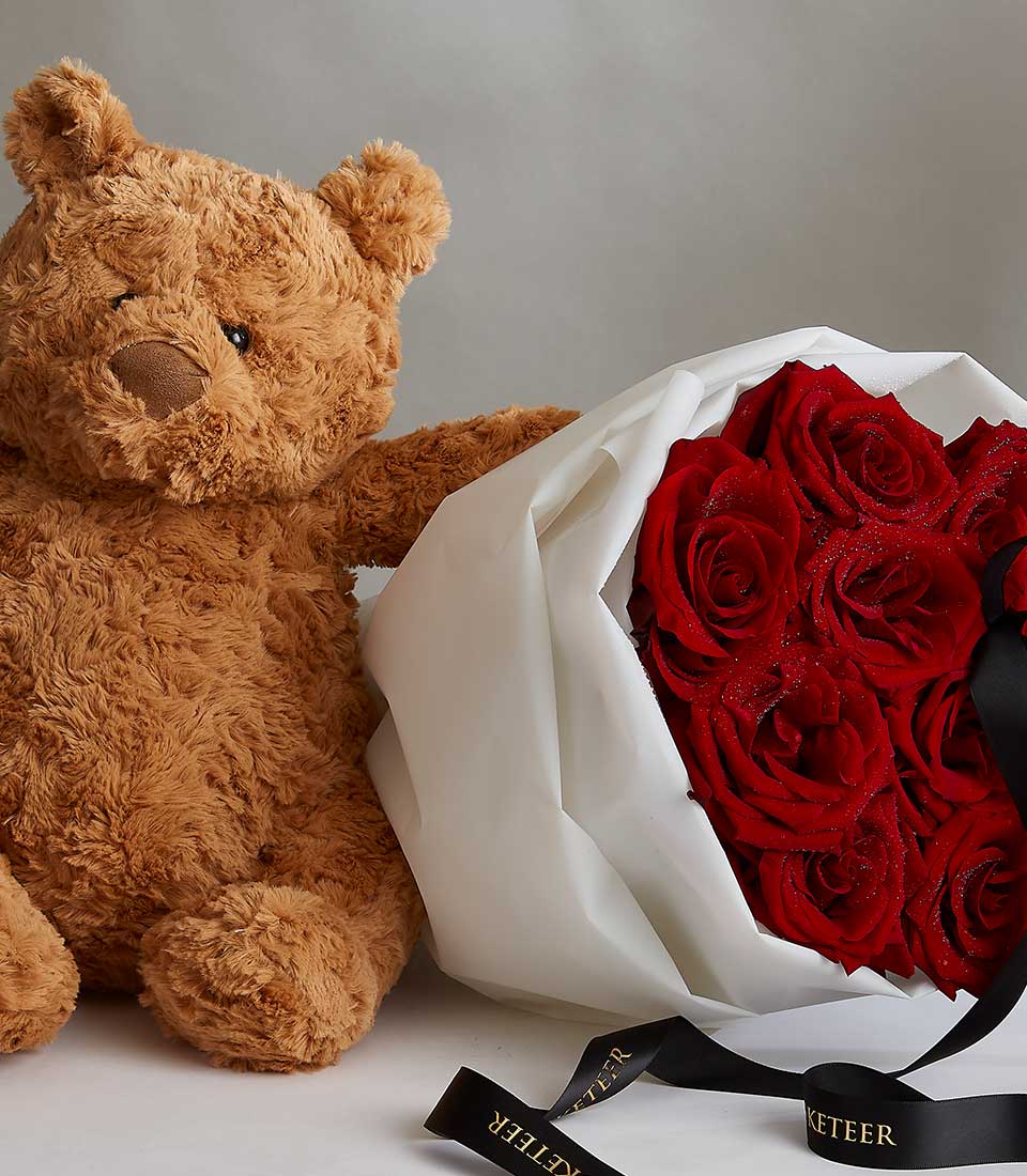Plush teddy bear with a bouquet of red roses, wrapped in white with black ribbon. A heartfelt gift perfect for romantic moments.