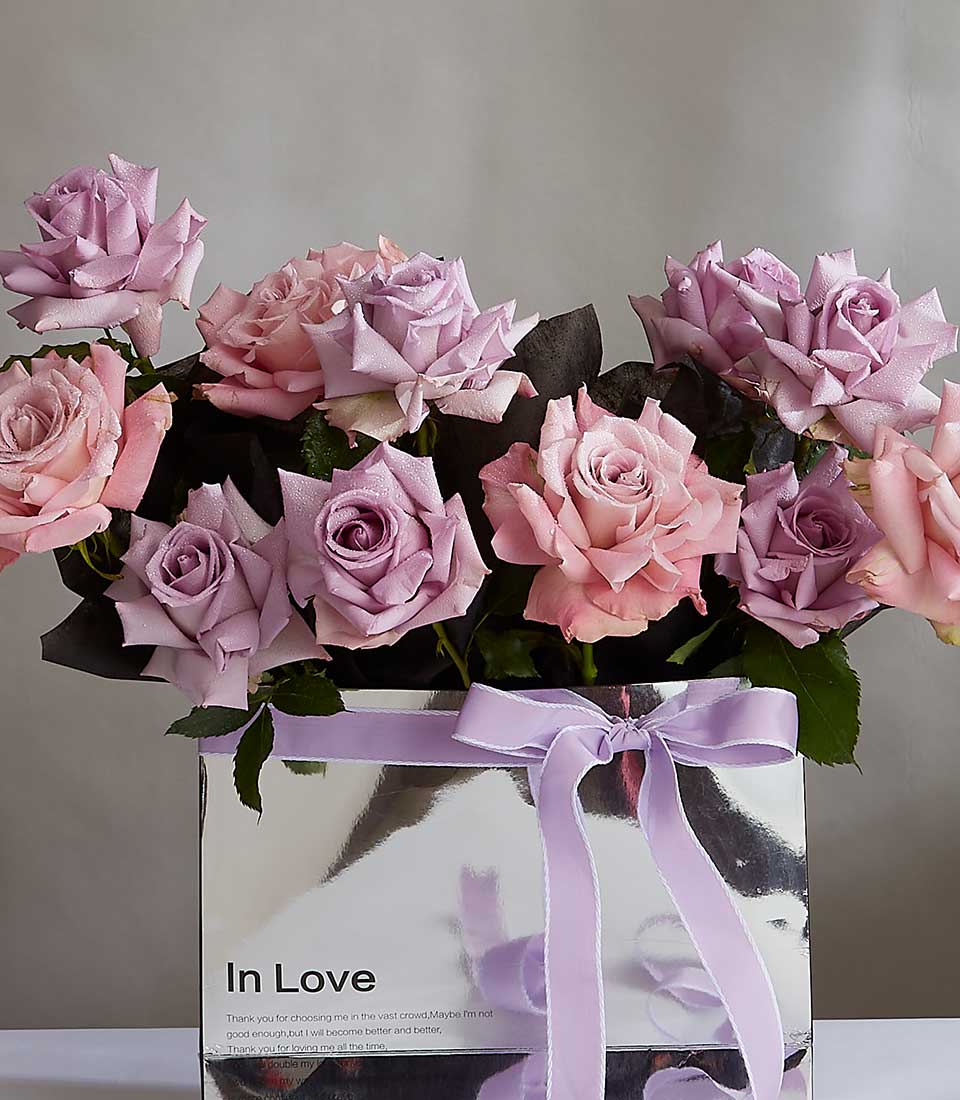 A sweet rose ensemble of light pink and lavender roses in a silver box with 'In Love' written on it, finished with a light purple bow ribbon.