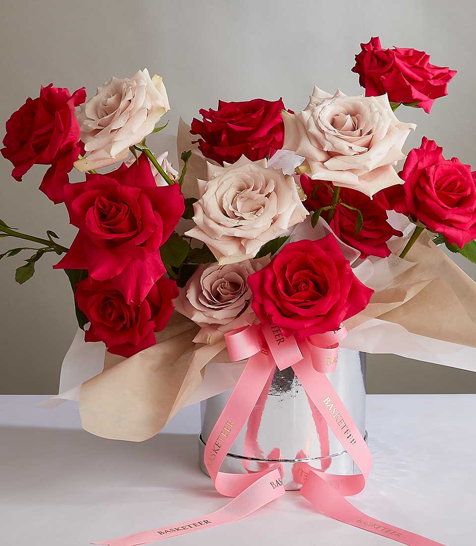 Romantic Sweet Pink Roses Gift Box Make every moment memorable with this exquisite vase bouquet featuring vibrant crimson and soft blush roses. Hand-tied with delicate pink ribbons, this arrangement is ideal for expressing love, admiration, or celebration.