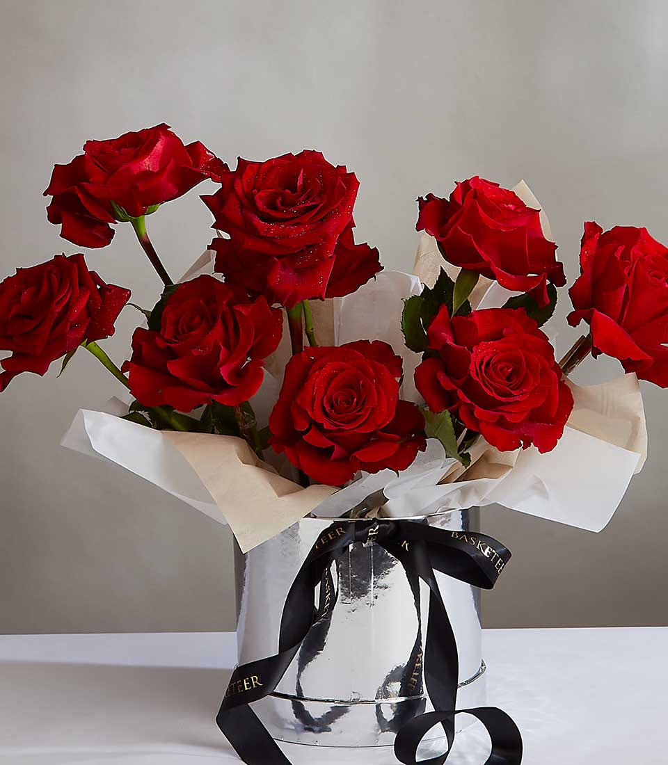 Capture the essence of love with vibrant red roses in a metallic vase, wrapped in white paper, and tied with a black ribbon. A perfect Valentine’s gift.