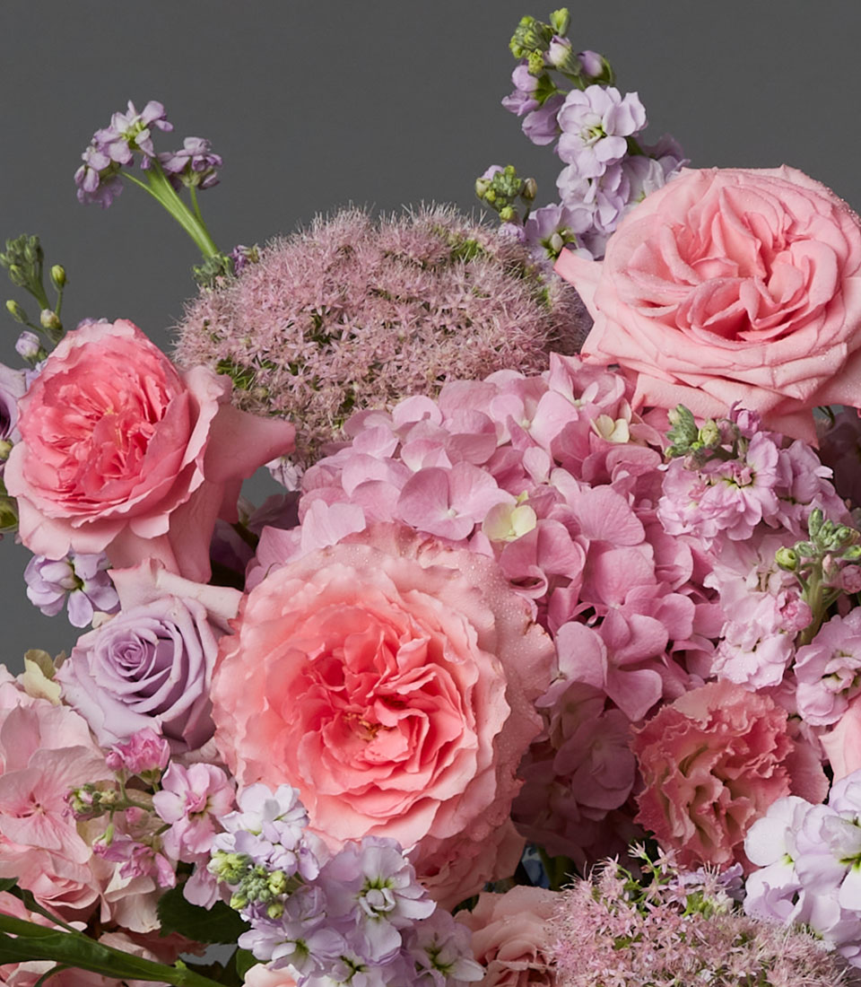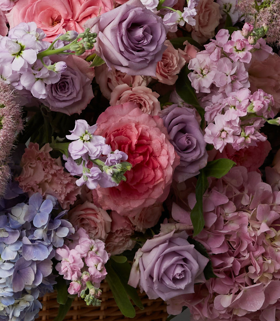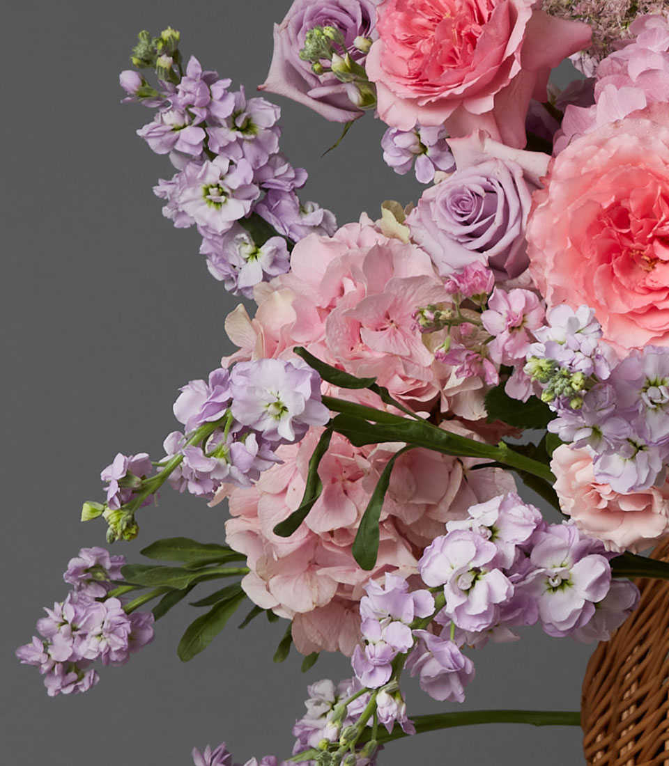 Elegant pink and purple flower basket with roses and hydrangeas. A romantic gift for special occasions. Same-day delivery in Bangkok.