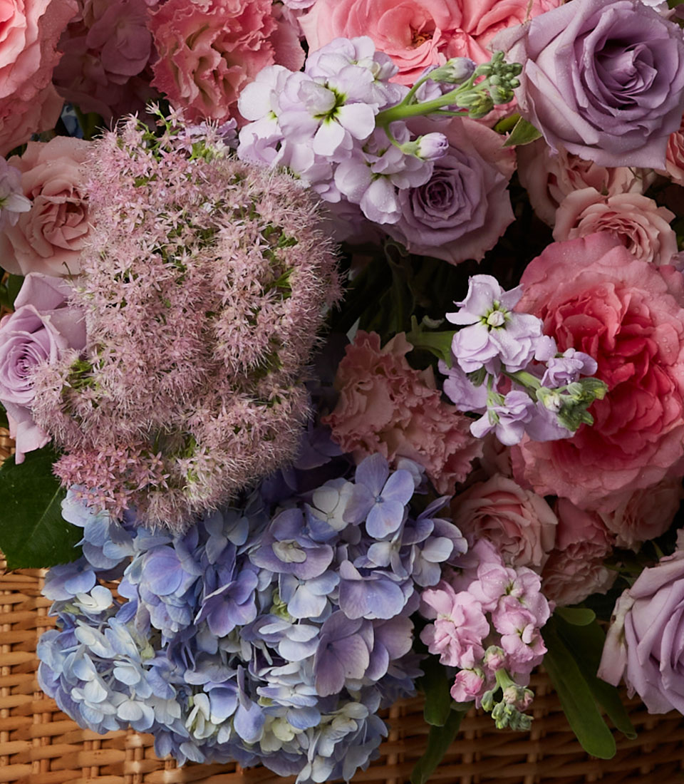 Luxurious Enchanted Flowers Basket Bring charm and elegance into any space with our Enchanted Blossom Garden Basket. This premium floral arrangement features a breathtaking blend of blush pink hydrangeas, lavender roses, and romantic seasonal blooms. Nestled in a classic woven basket, it radiates softness and sophistication.