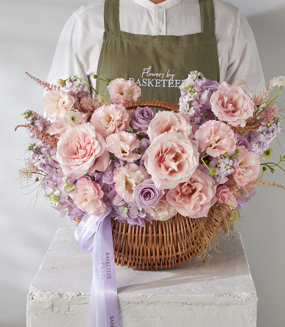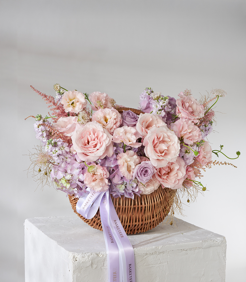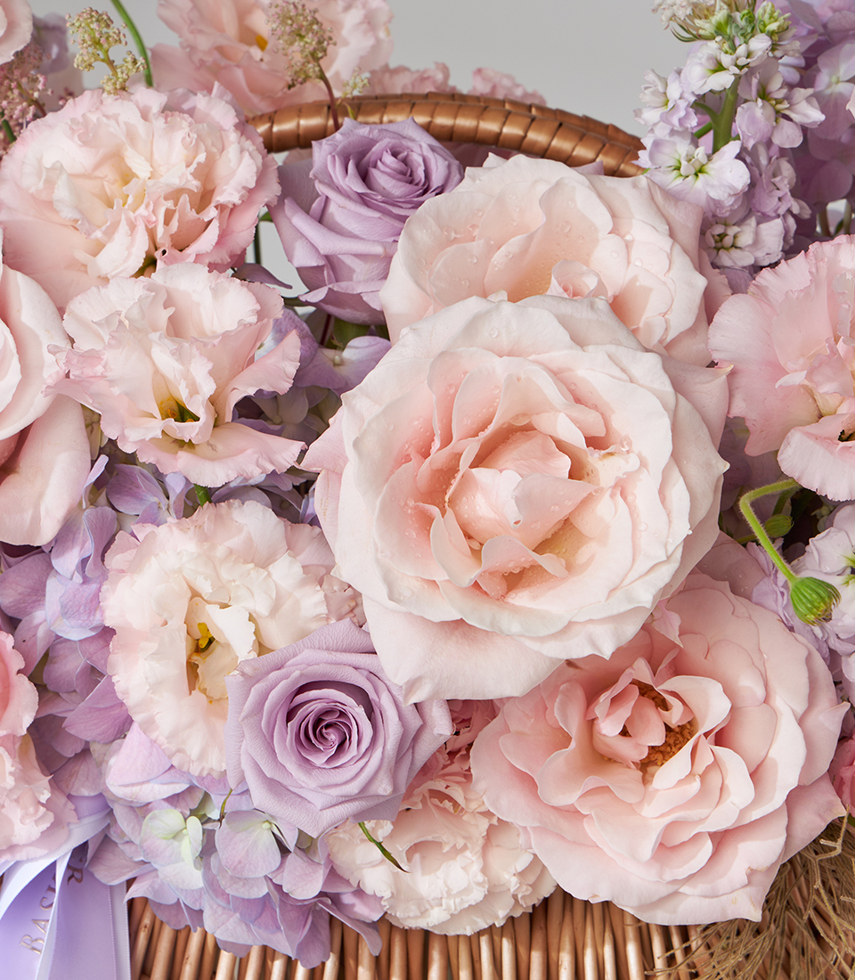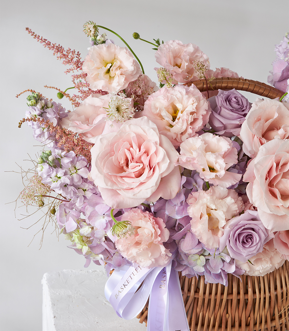 A delicate basket bouquet of blush pink roses and purple lisianthus with hydrangeas and pastel accents—perfect for birthdays, anniversaries, or same-day delivery in Bangkok.