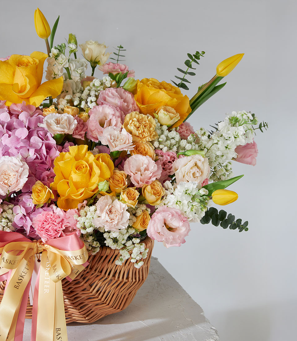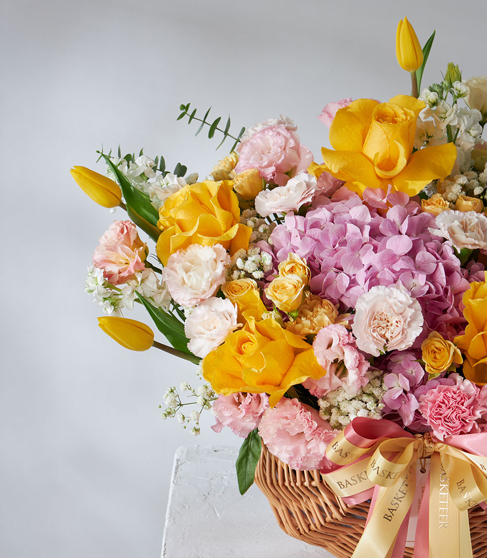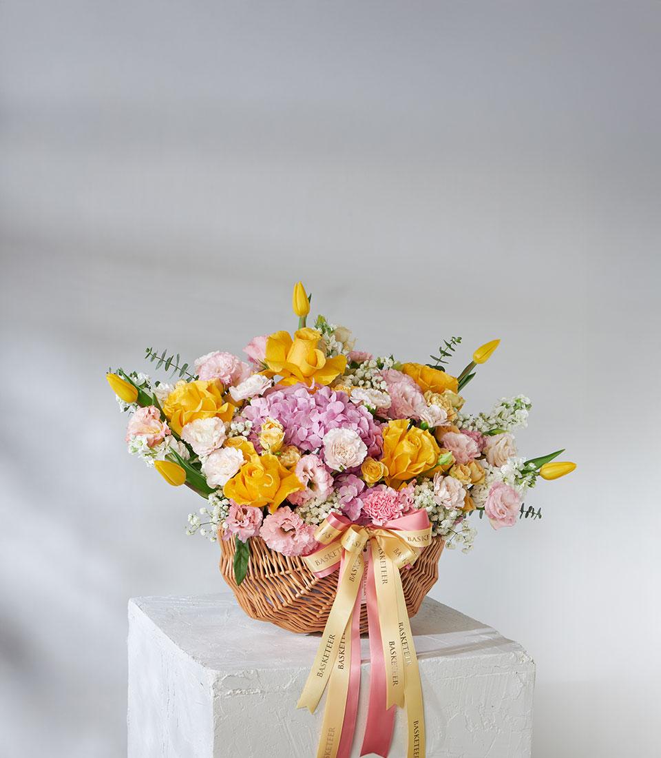 Cheerful flower basket featuring Brighton roses imported from Ecuador with tulips, hydrangeas, and lisianthus in soft yellow and pink tones. Designed to brighten any day — ideal for birthdays, celebrations, or get-well wishes.