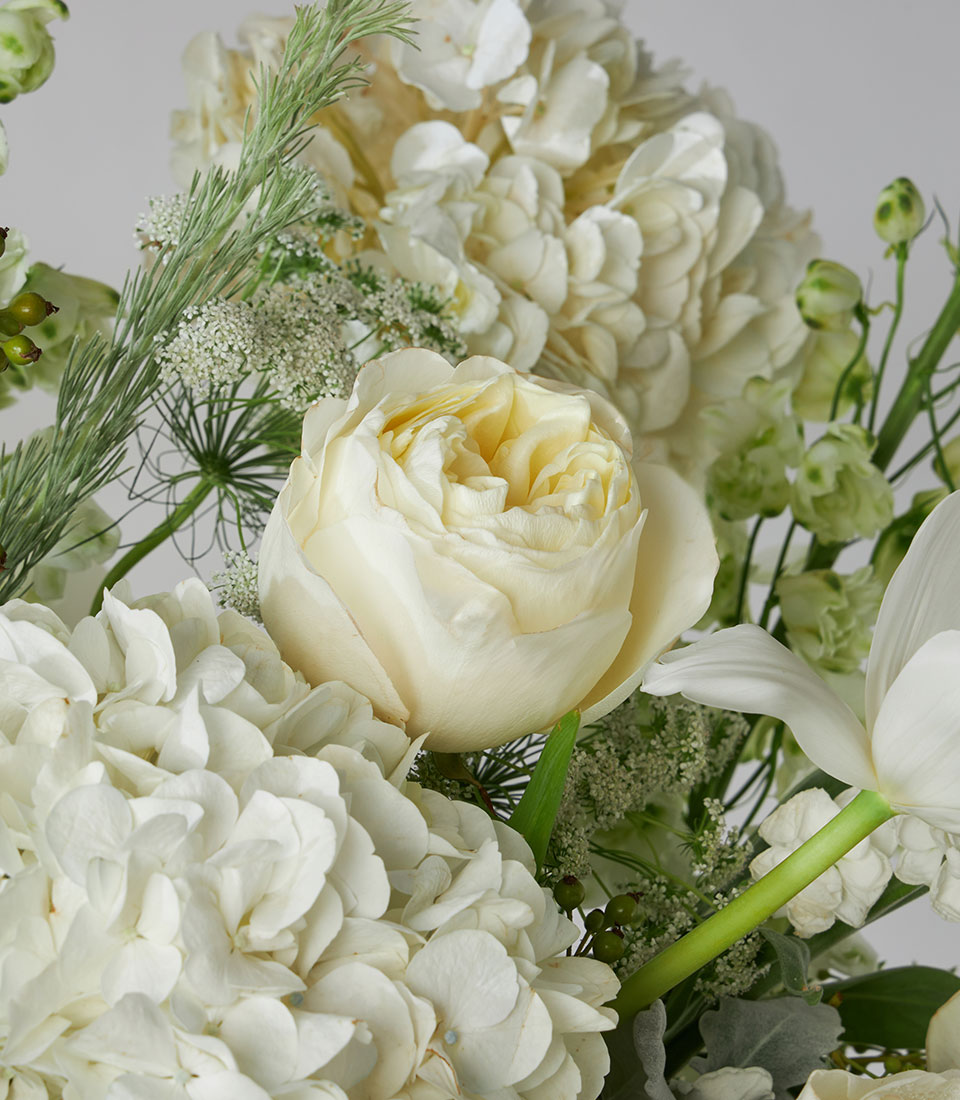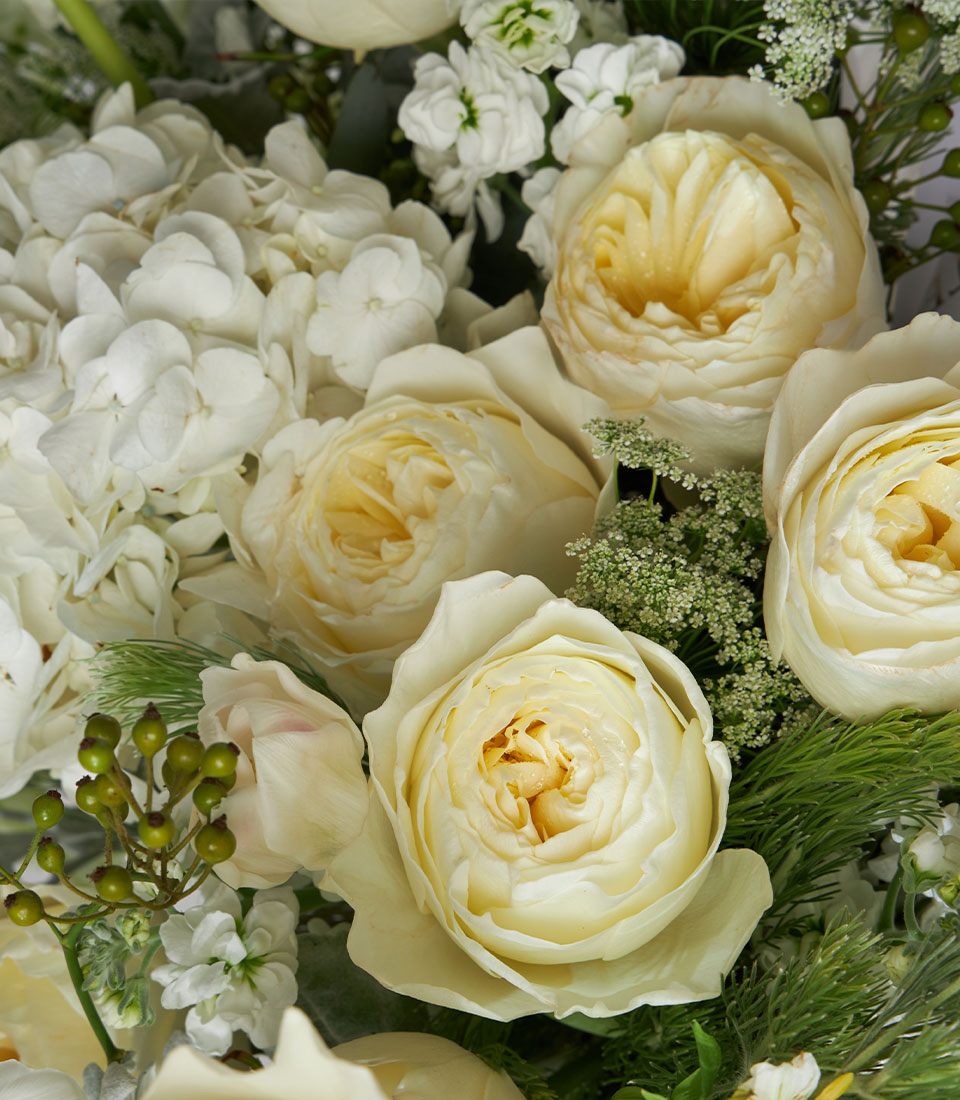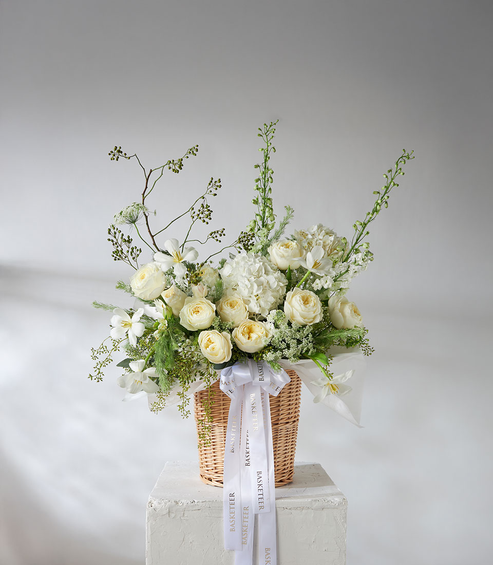 Elegant white flower basket featuring Coldplay roses imported from Ecuador, paired with white hydrangeas, delphiniums, tulips, and lush greenery. Designed for timeless beauty — ideal for formal occasions, appreciation, or heartfelt wishes.