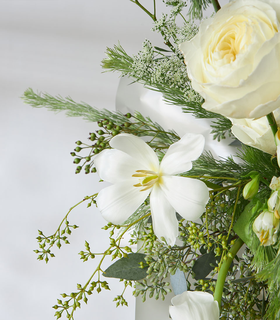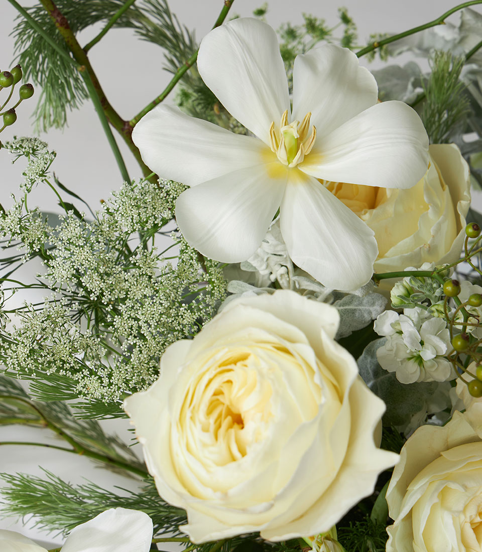 Pure Elegance Flower Basket A refined basket with Playa Blanca Roses in pure white tones, paired with soft greens to convey serenity, elegance, and heartfelt wishes.