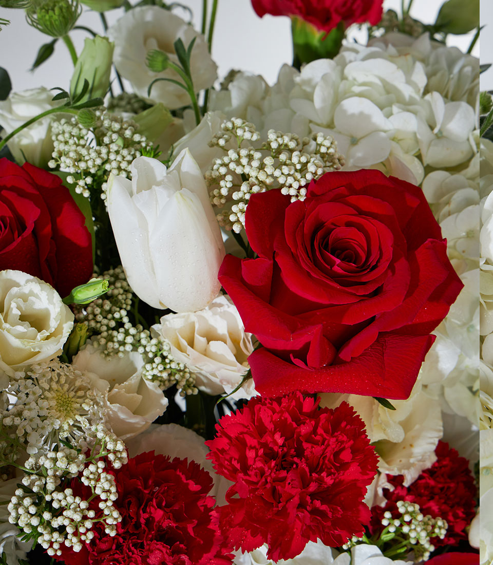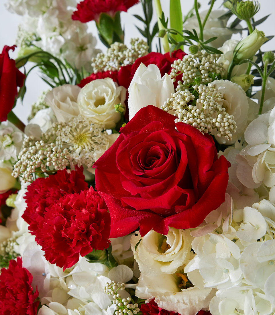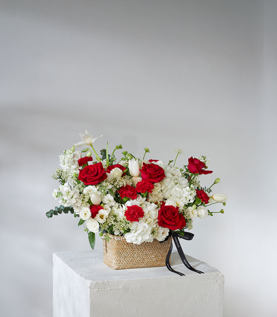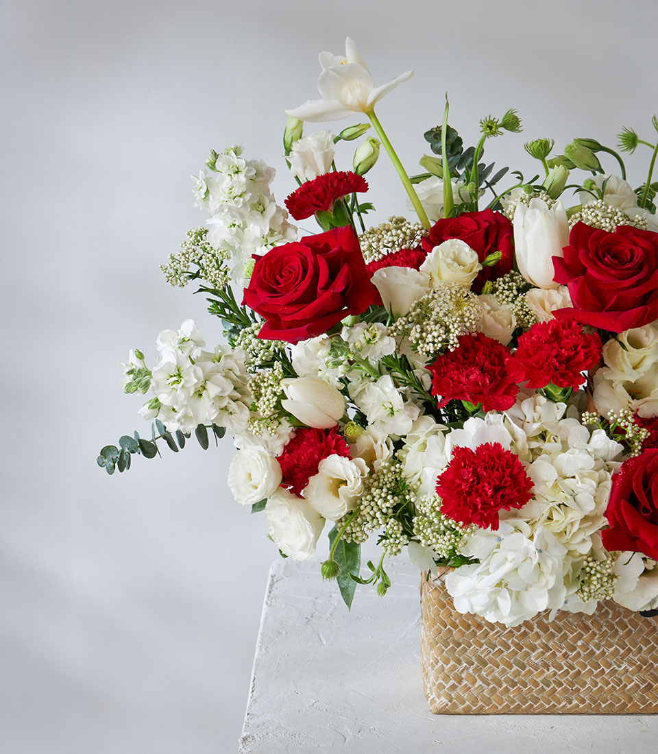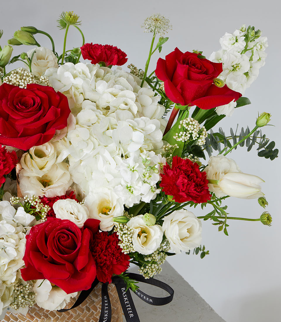 Elegant flower basket featuring Explorer red roses imported from Ecuador, paired with white hydrangeas, carnations, and lisianthus. A classic design that perfectly expresses love, respect, and appreciation.