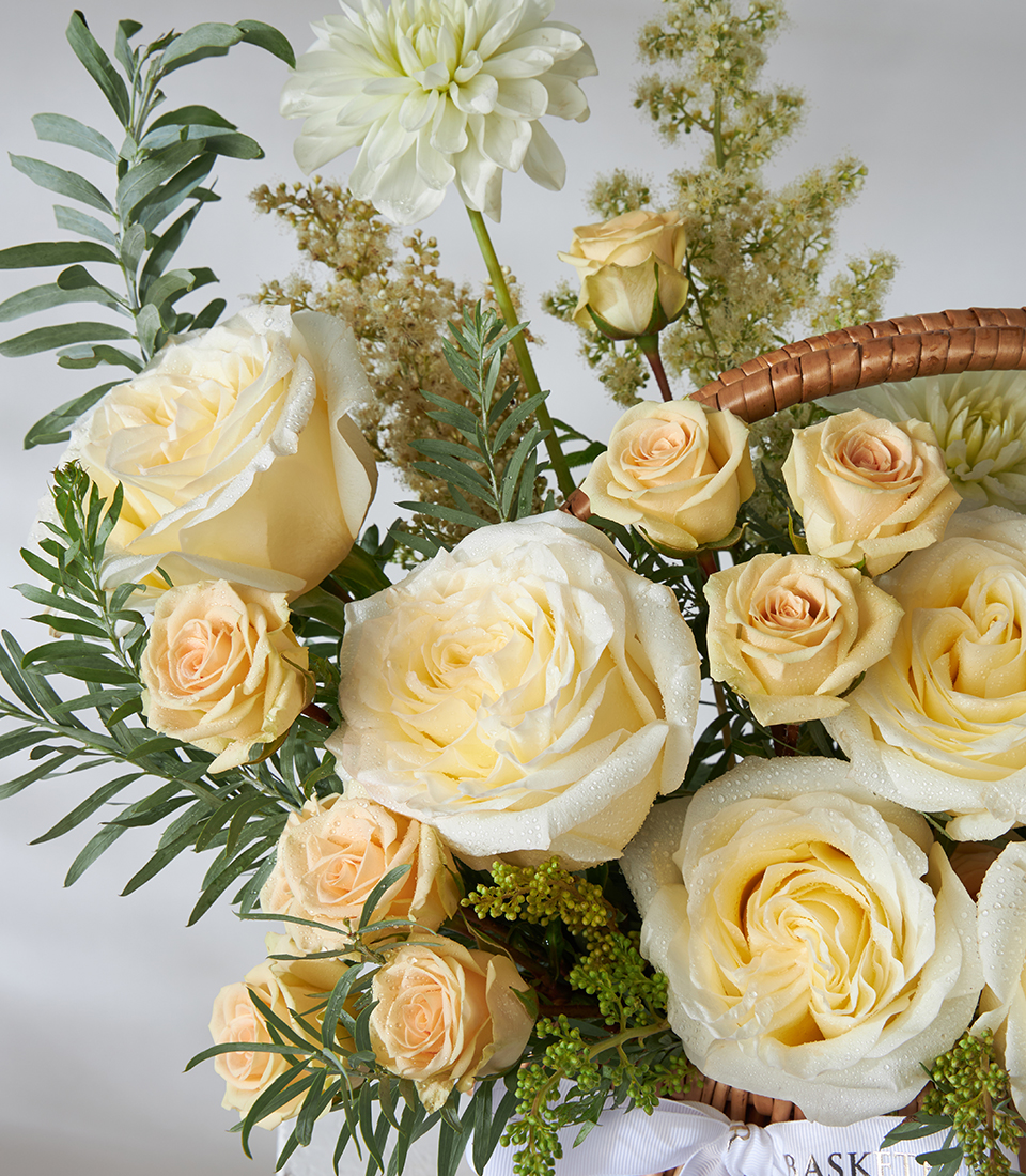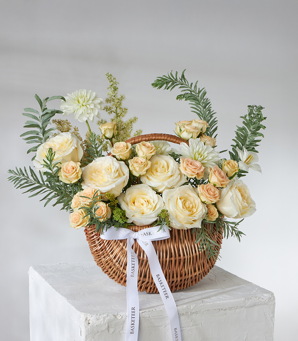 A refined rattan basket overflowing with creamy ivory roses, peach spray roses and fresh greenery—elegant, gift-ready and available for same-day delivery in Bangkok.