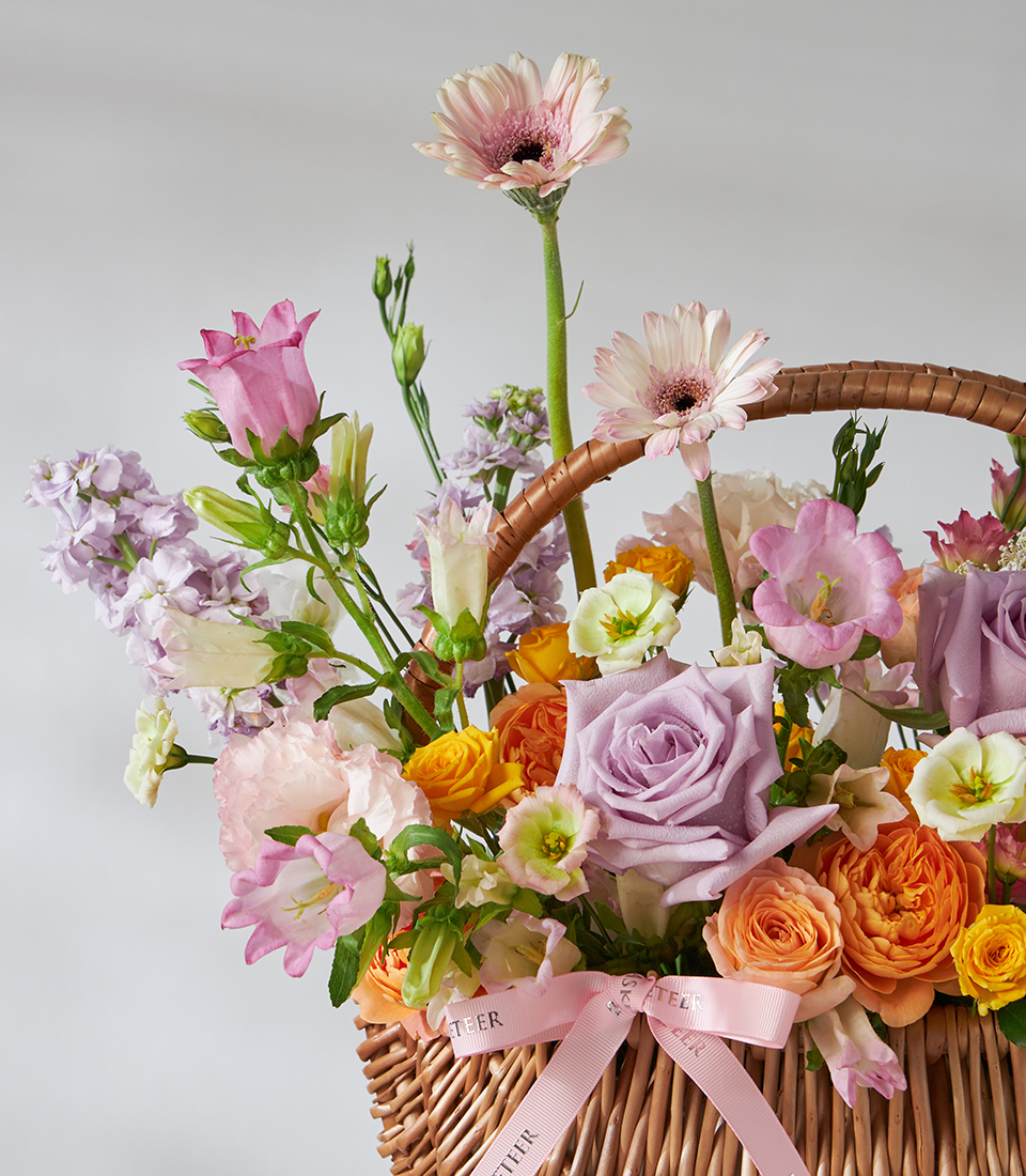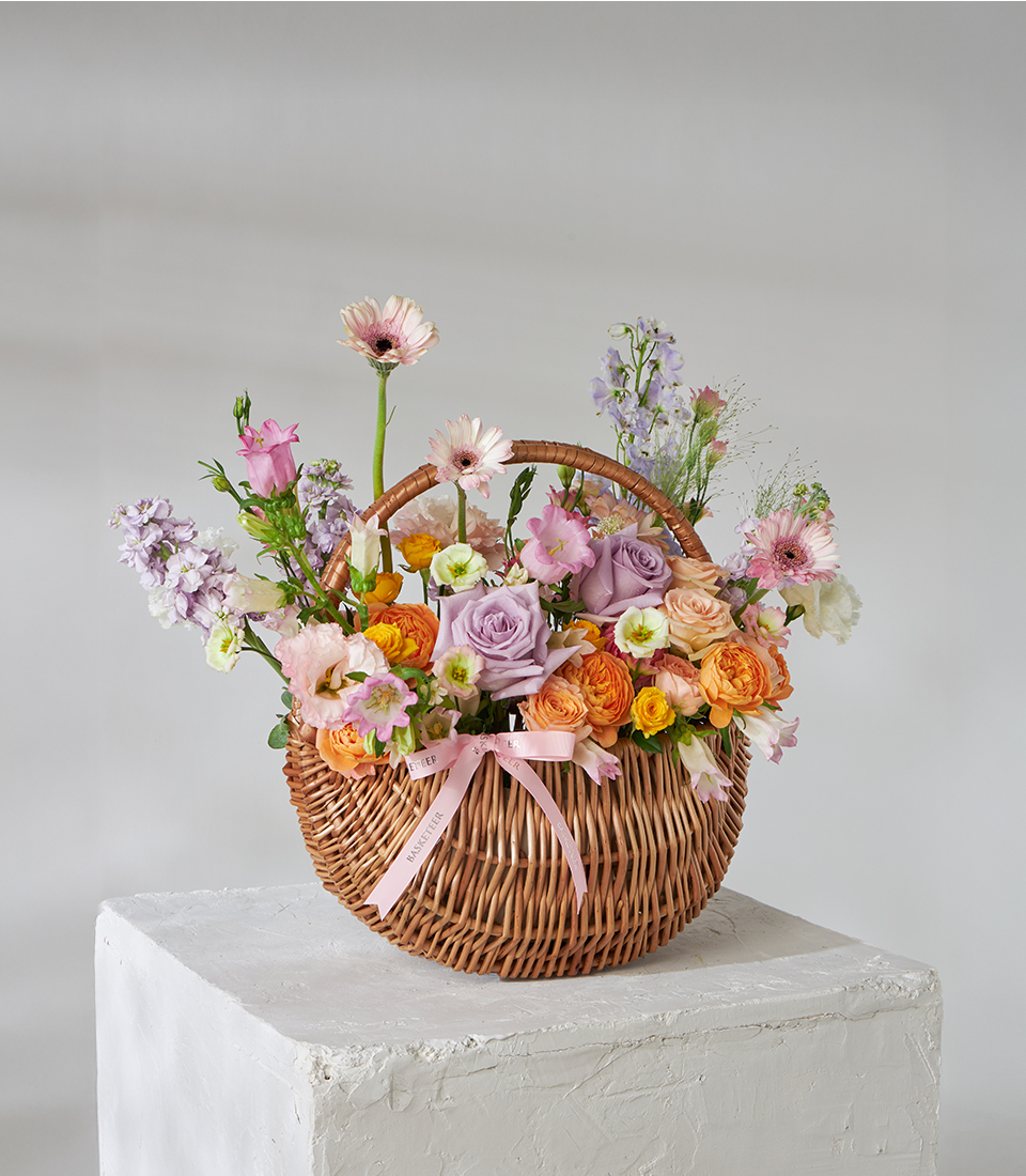 Charming basket bouquet featuring lavender roses, peach spray roses, and pink daisies with soft fillers, beautifully arranged with a pink ribbon—perfect for birthdays, thank-you gifts, and same-day delivery in Bangkok.