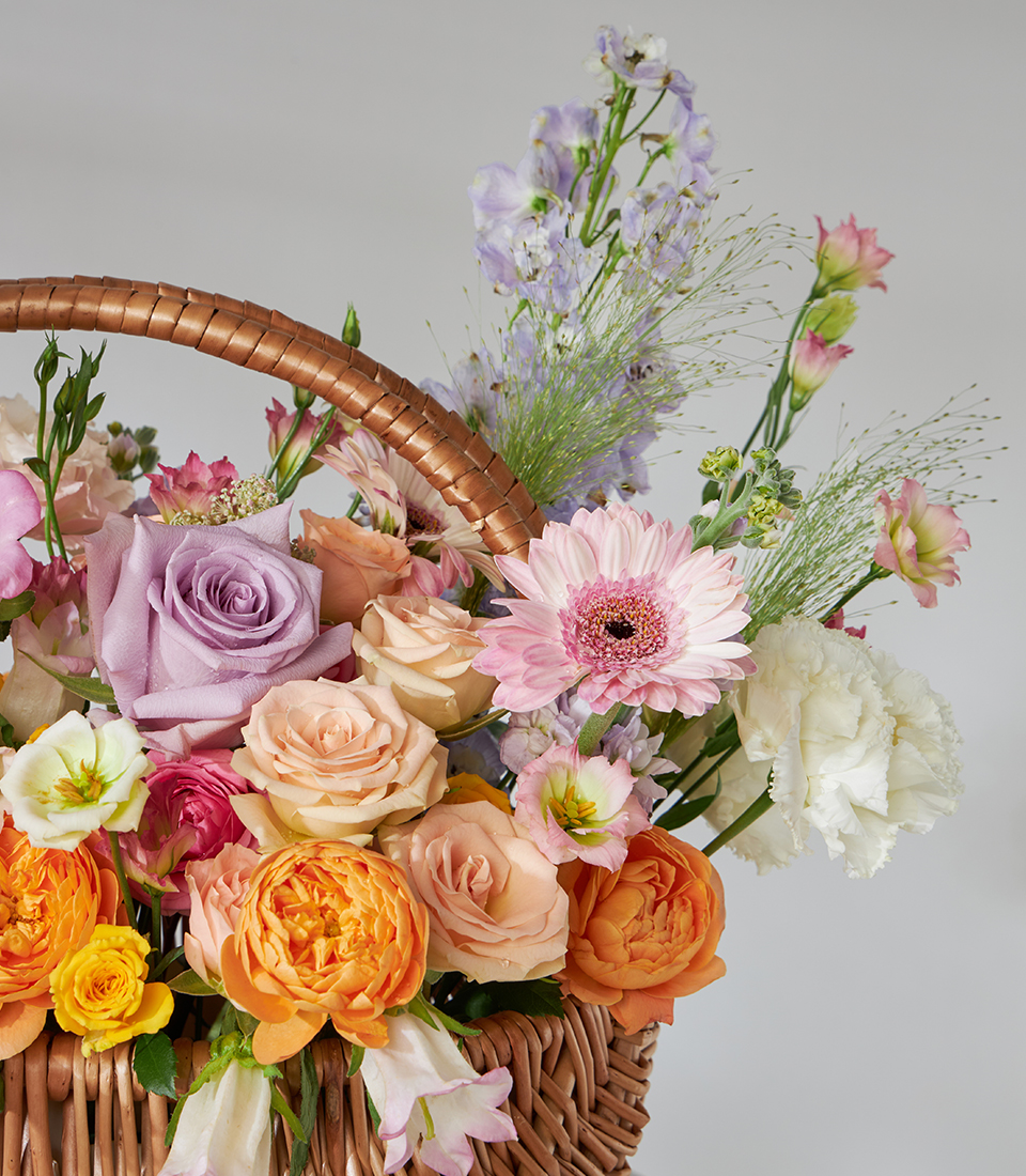 • Arranged in a rustic round wicker basket with handle for a natural look.