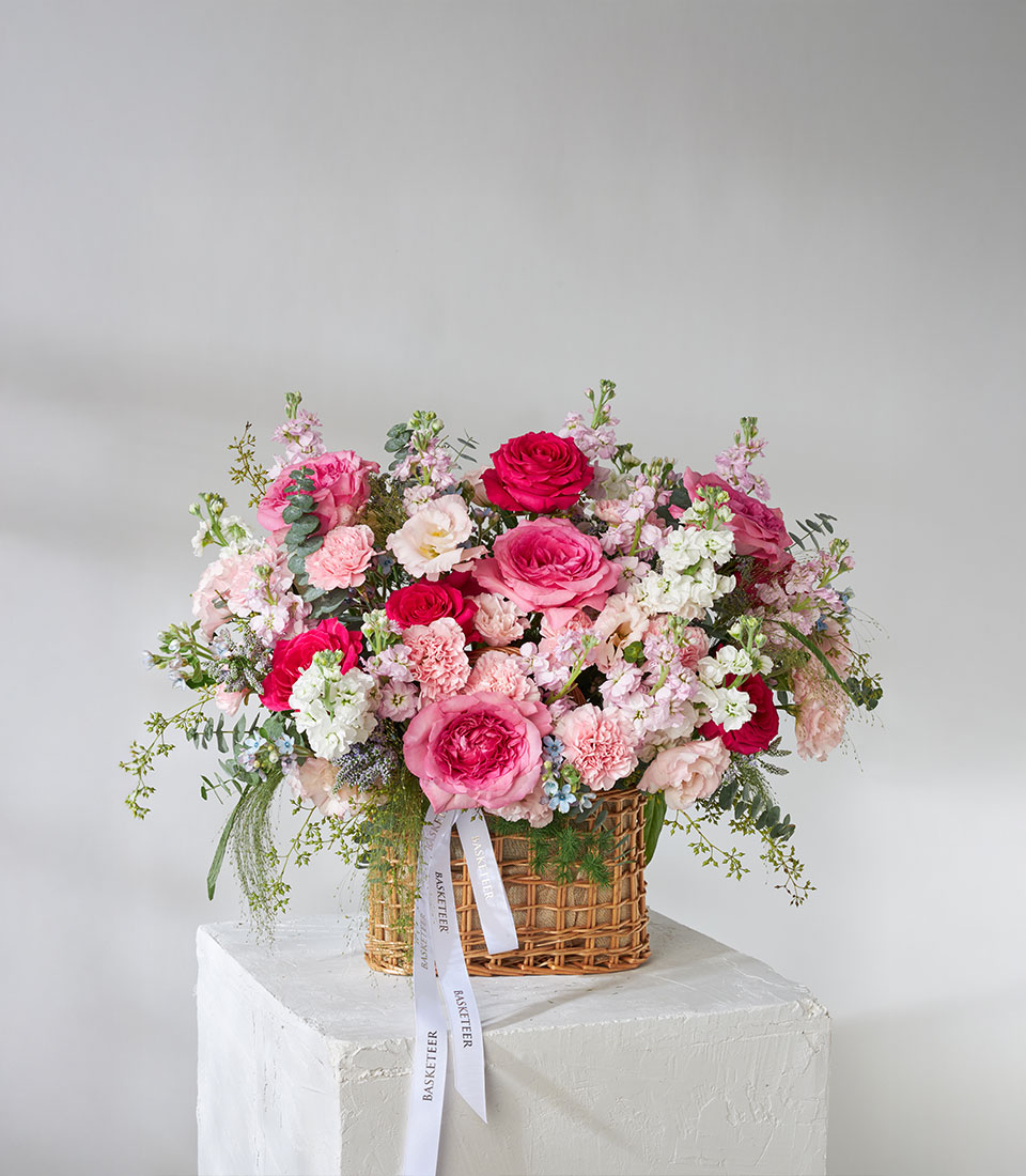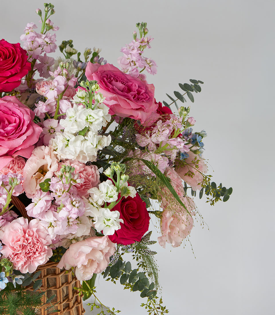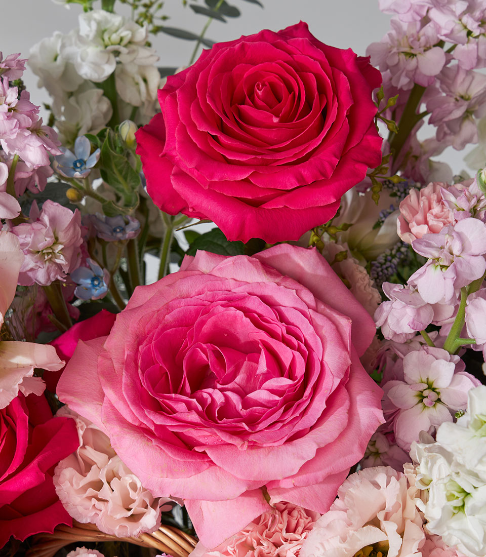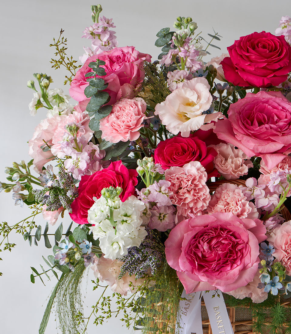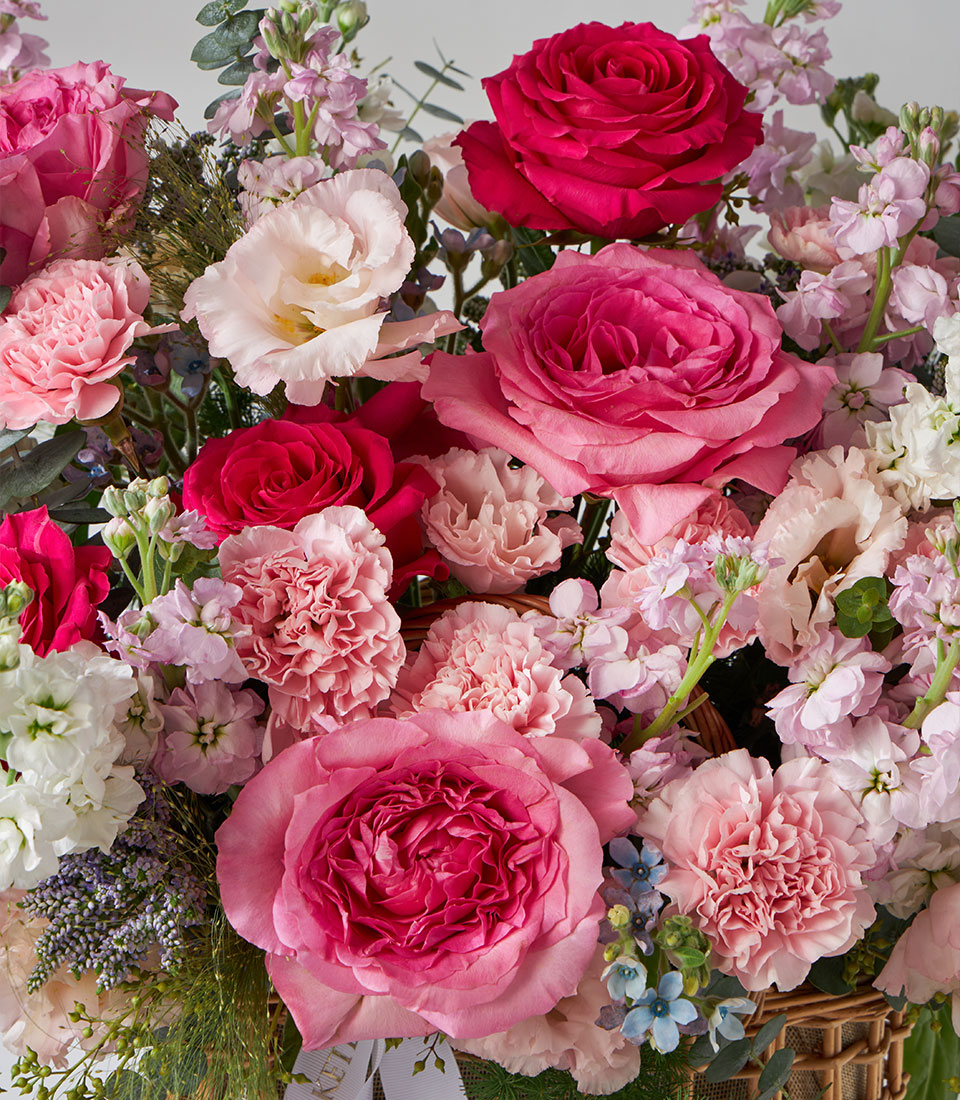 Lush garden-style flower basket featuring Nuage and Full Monty roses imported from Ecuador. Arranged with carnations, stock, and lisianthus in romantic pink tones. A heartwarming gift to celebrate any joyful moment.
