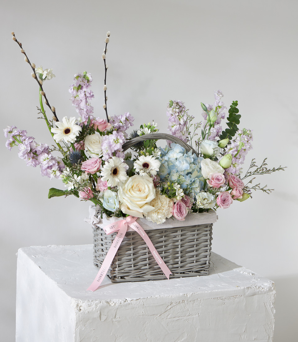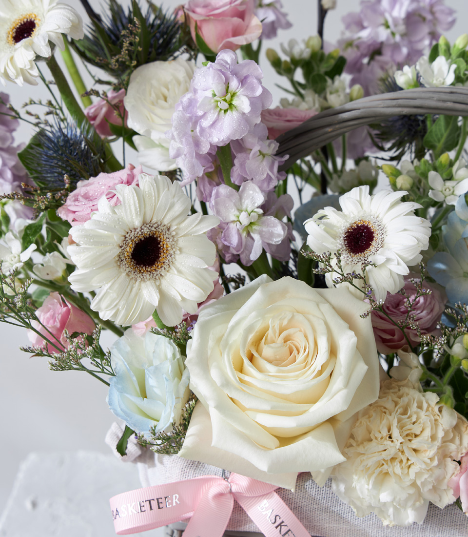 Color Tone : Pastel Tone1 stems of Playa Blance Roses – Exclusive Roses Imported from EcuadorAccented with spray roses, hydrangeas, stock, and gerbera, this basket brings refined elegance with a romantic pastel charm.Grey rattan basket with linen lining, finished with Basketeer signature ribbon in soft pink for a refined and delicate look.Natural Grey Wicker Basket with White Lining : BK-396-S