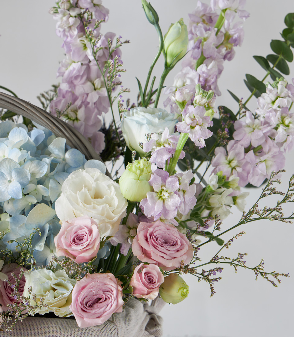 Pastel Serenity Flower Basket A graceful basket with Playa Blanca Roses and pastel blooms in soft lavender, pink, and blue tones, designed for elegant and heartfelt occasions.