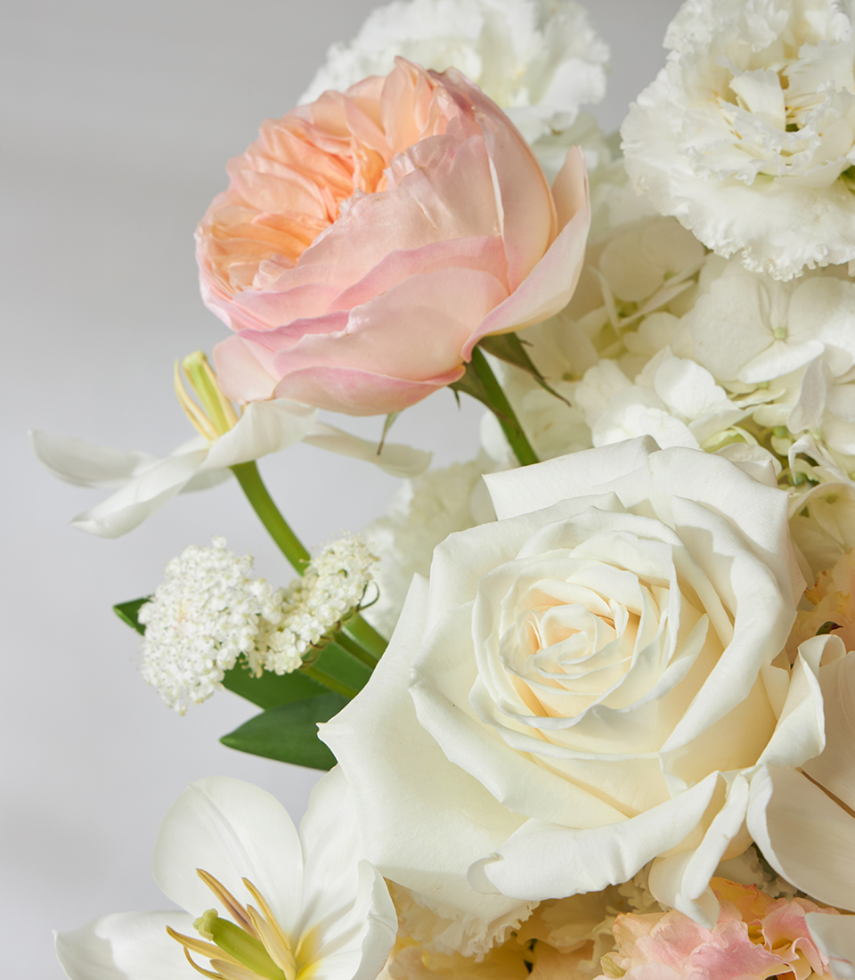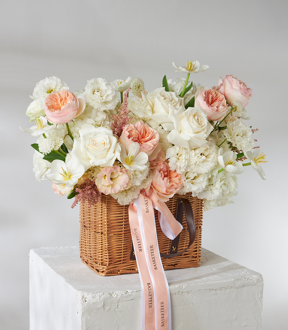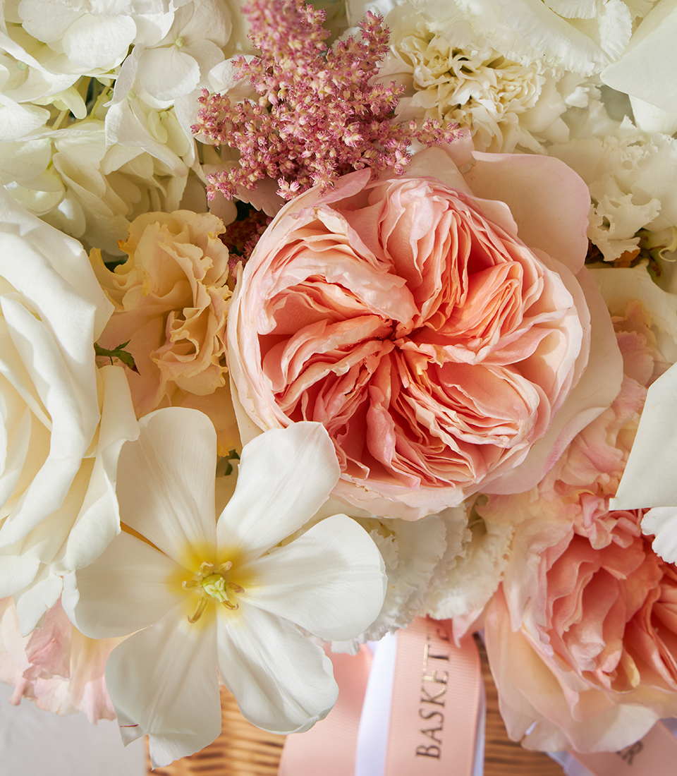 A refined basket bouquet of peach garden roses with elegant white roses and delicate seasonal blooms—perfect for weddings, anniversaries, or same-day delivery in Bangkok.