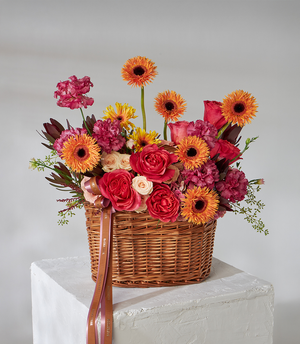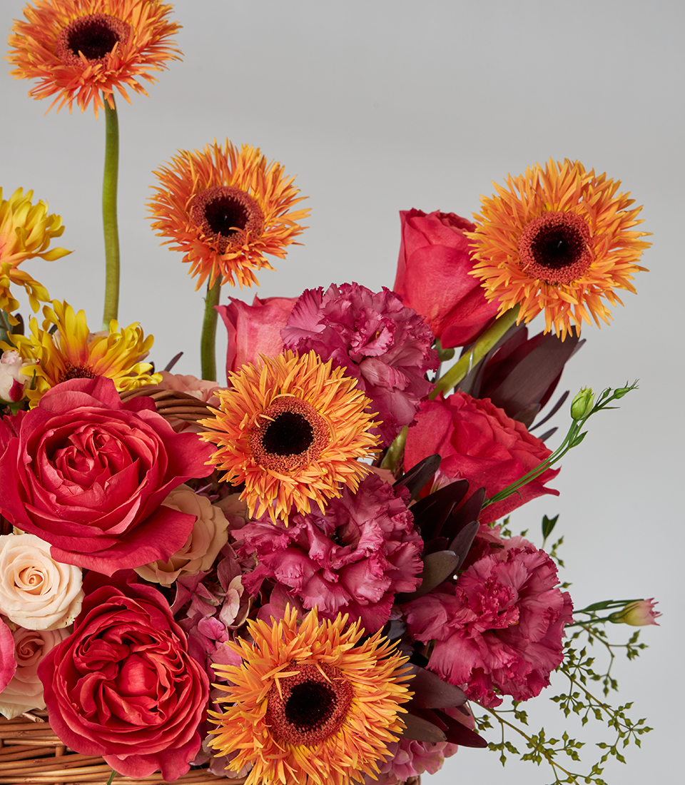 A vibrant basket bouquet of red roses and orange gerbera daisies accented with carnations and greenery—perfect for birthdays, congratulations, or same-day flower delivery in Bangkok.