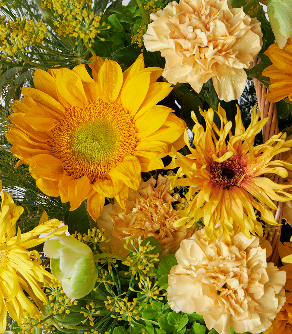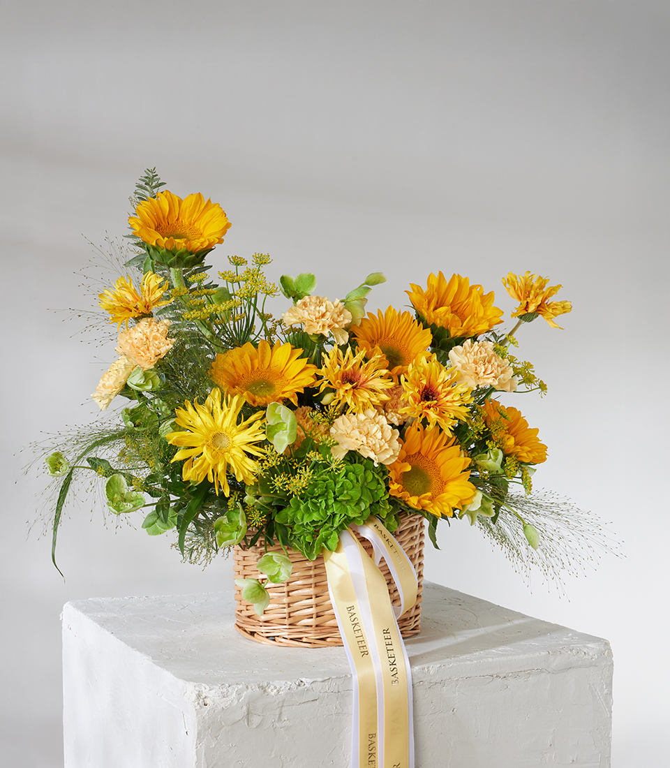A cheerful basket bouquet of sunflowers, yellow carnations and chrysanthemums accented with lush greenery and ribbon—perfect for birthdays, congratulations, and same-day delivery in Bangkok.