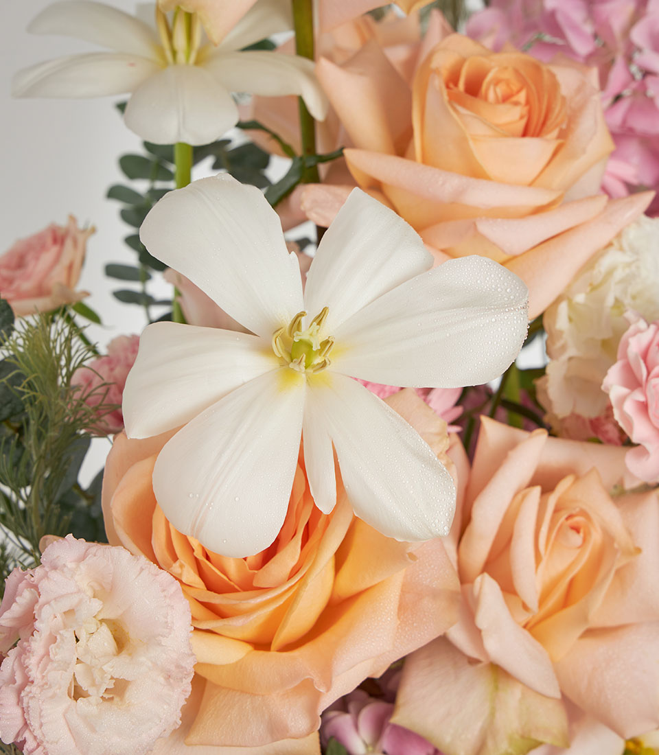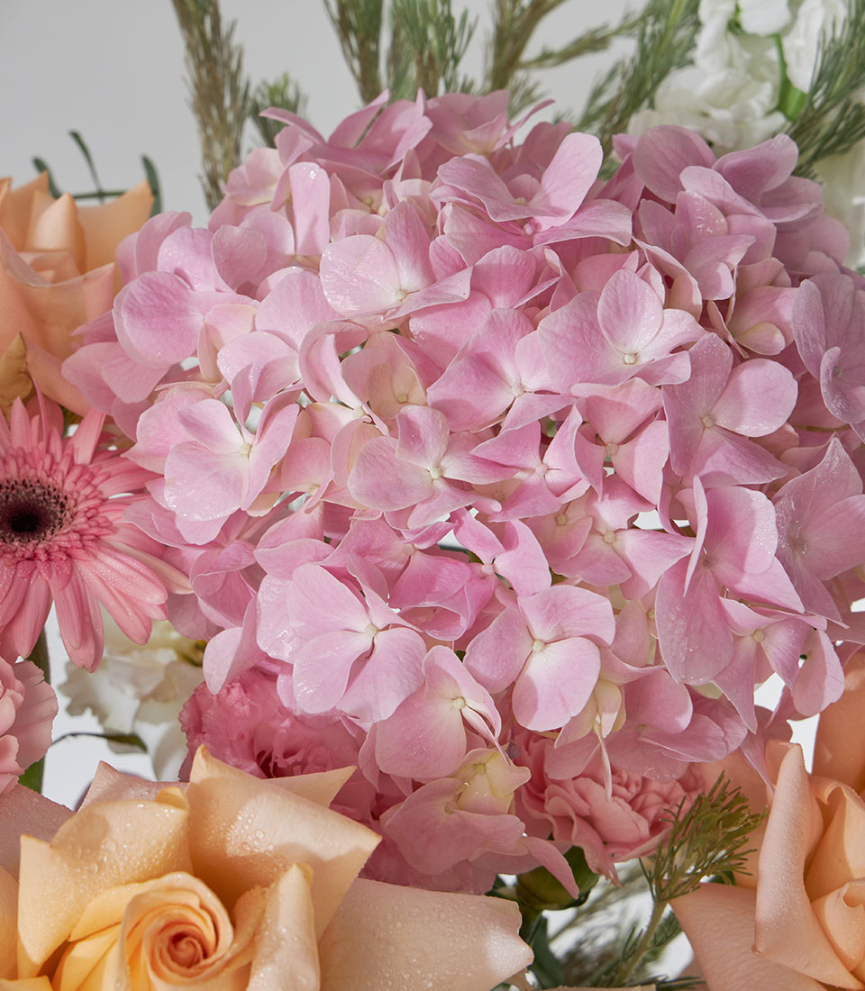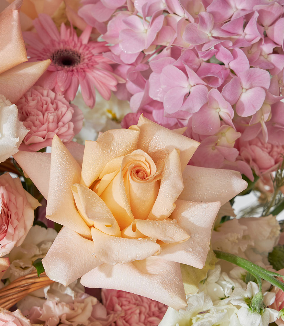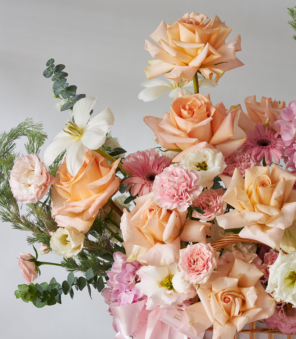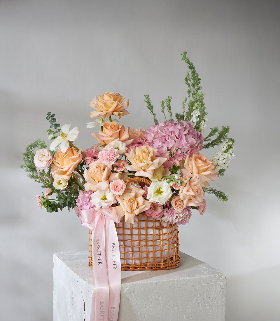 A graceful flower basket featuring imported Tiffany roses from Ecuador paired with pink hydrangeas, tulips, and lisianthus. The perfect elegant gift in soft peach and pink tones — ideal for birthdays, congratulations, or heartfelt appreciation.