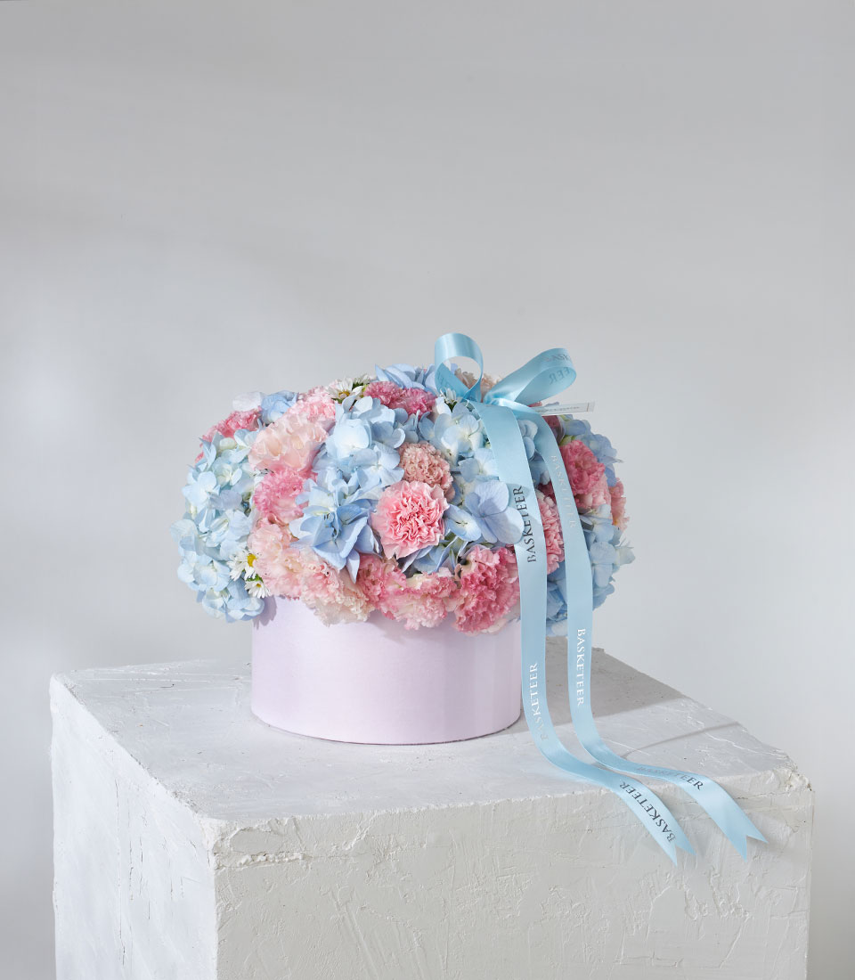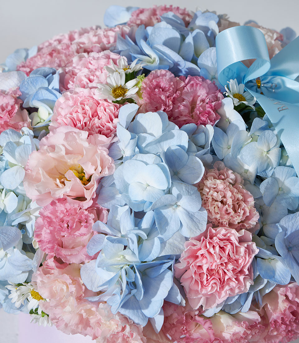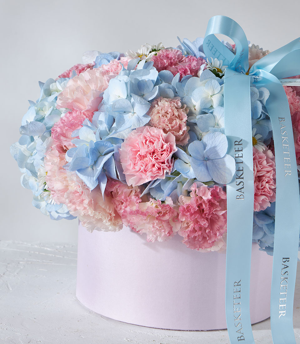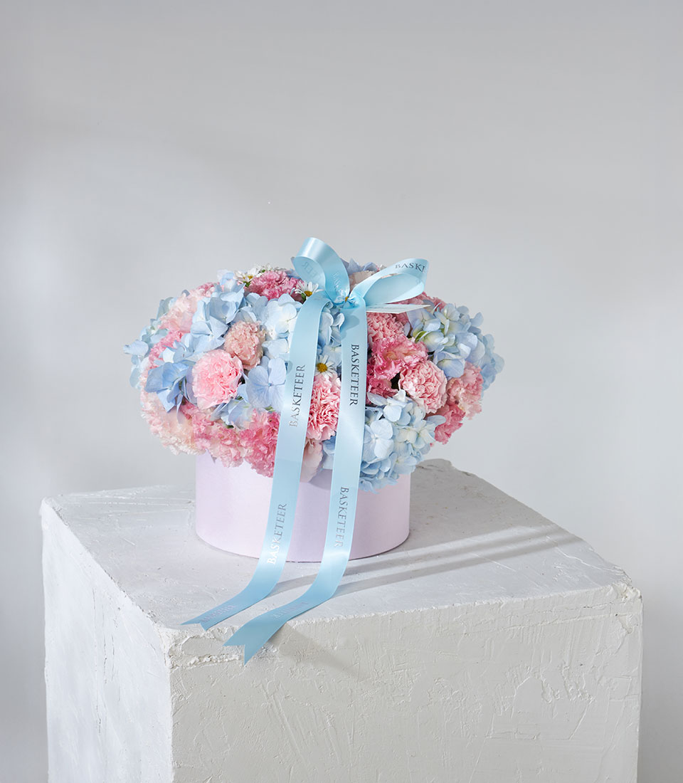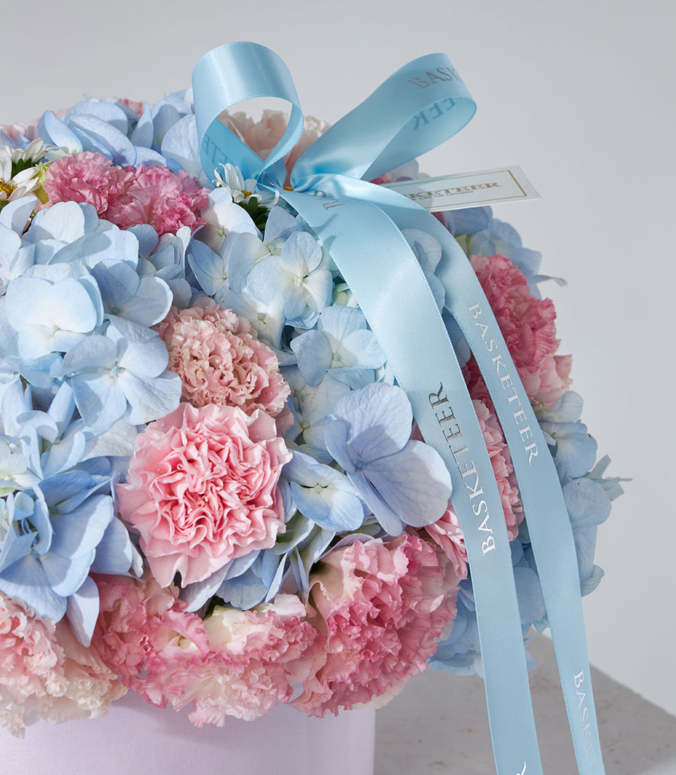 Soft pastel flower box featuring dreamy blue hydrangeas, pink carnations, and lisianthus blooms—arranged in a luxury pink round box with baby-blue Basketeer ribbon, available for same-day delivery in Bangkok.