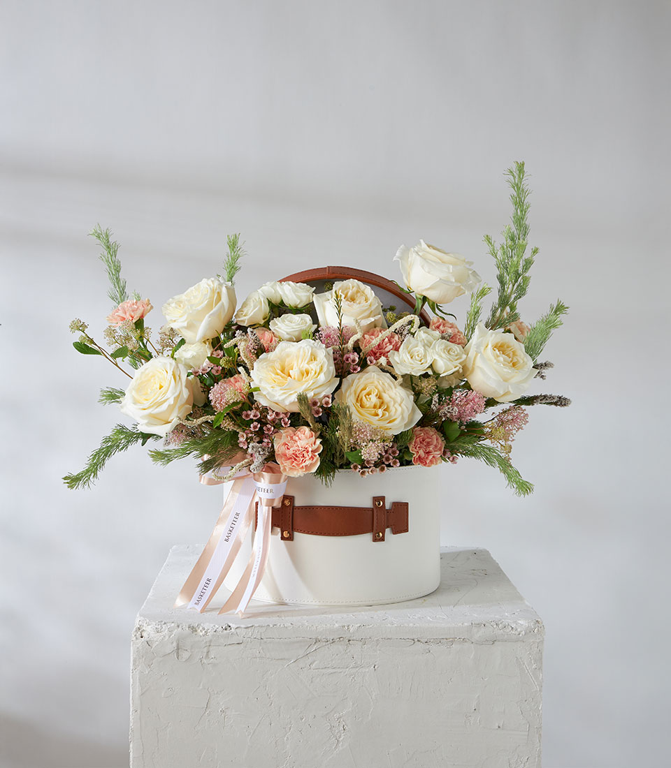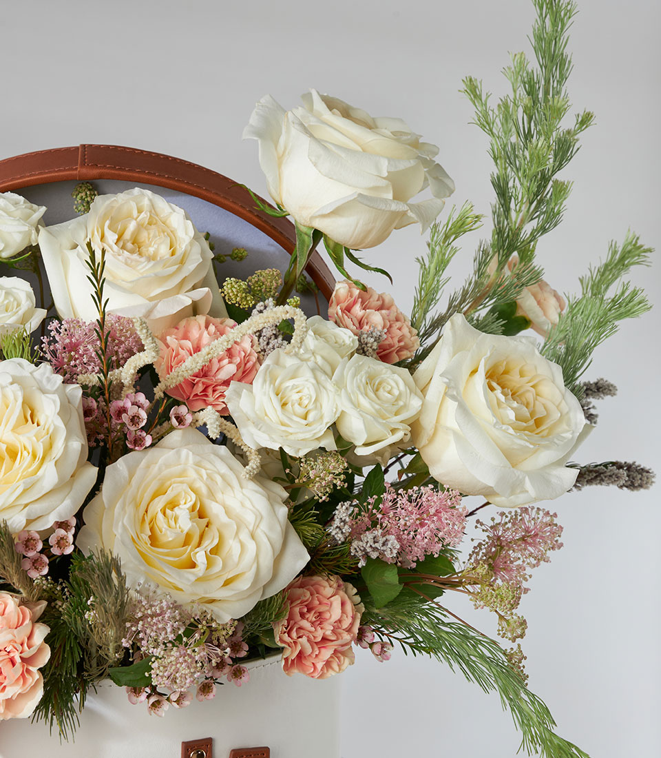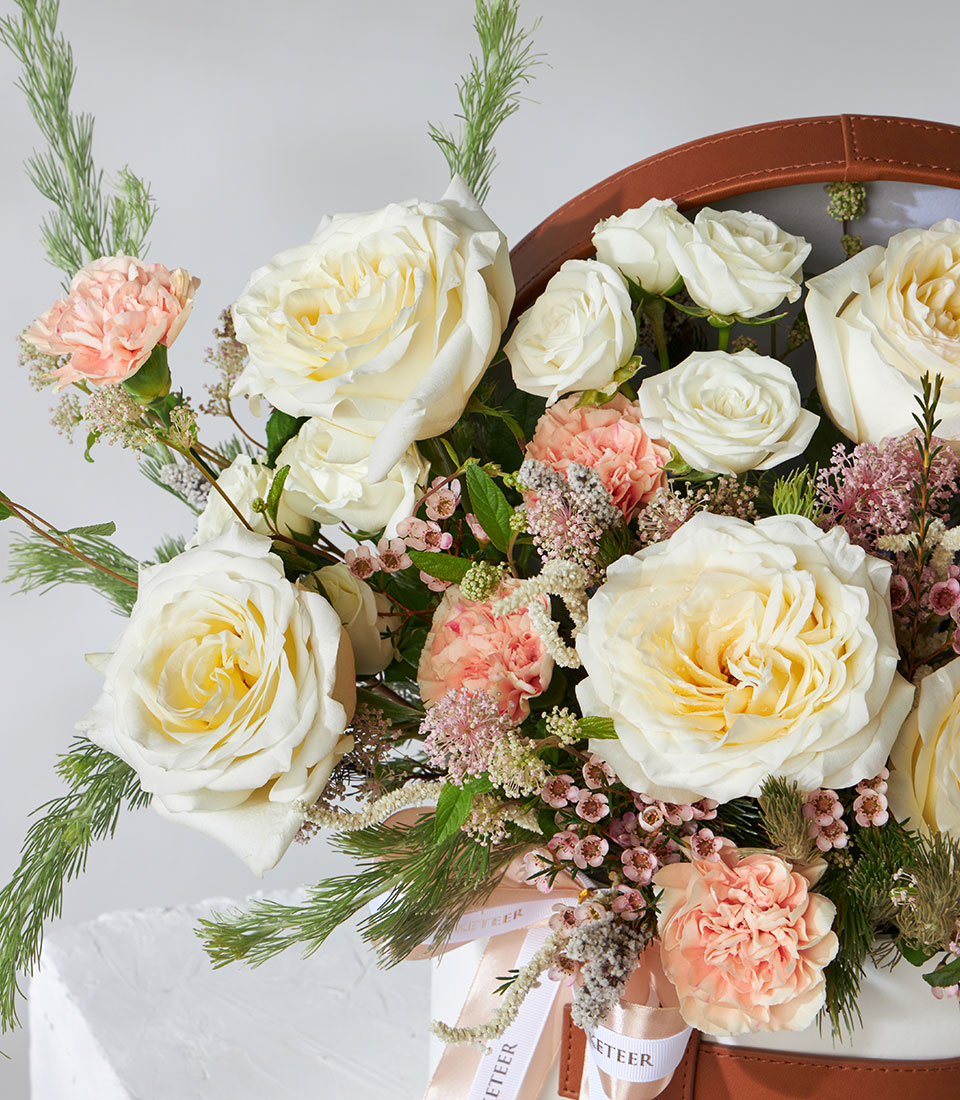 Elegant leather flower box featuring 7 stems of Candlelight roses imported from Ecuador, paired with pastel carnations, Majolica spray roses, waxflower, and textured greenery—crafted for sophisticated gifting with same-day delivery in Bangkok.