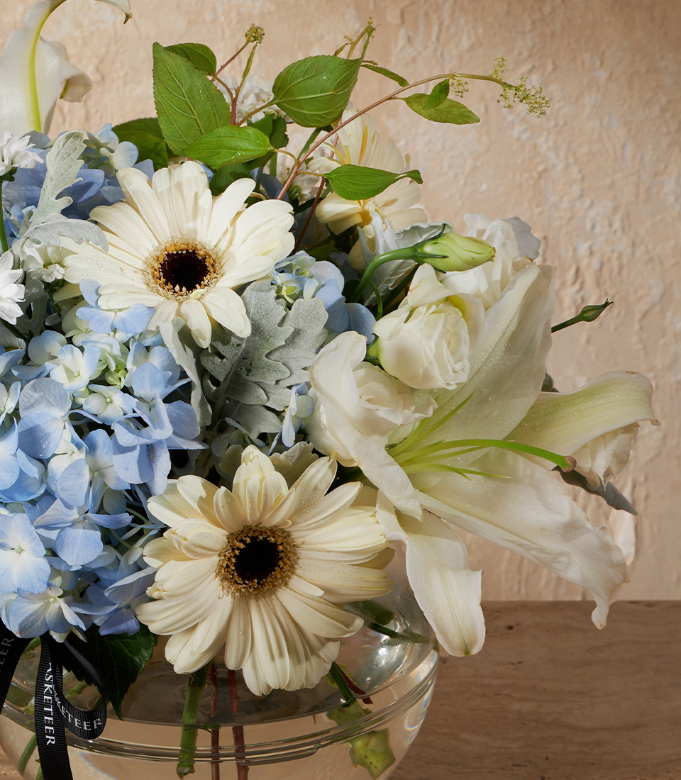 Elegant vase with blue hydrangeas white gerberas and lilies Perfect for birthdays anniversaries or sending congratulations with Bangkok flower delivery