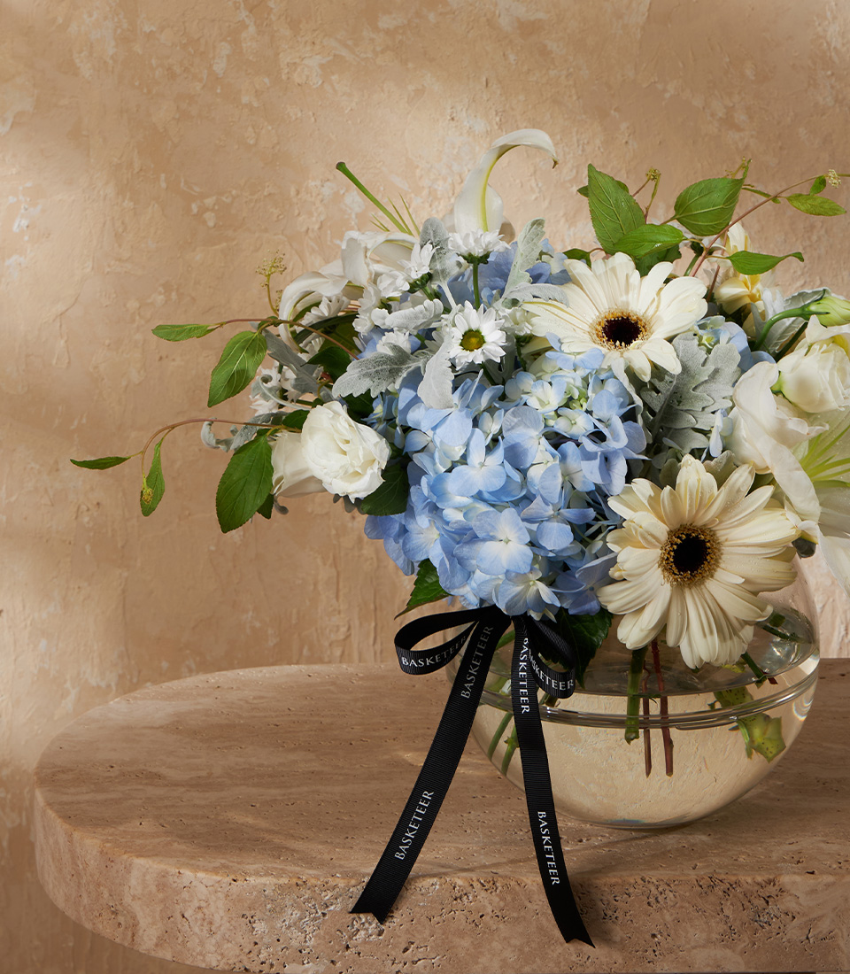 Blue Harmony Vase Arrangement An elegant vase adorned with white lilies and blue hydrangeas, reflecting peace, purity, and refined luxury. Ideal as for special celebrations.