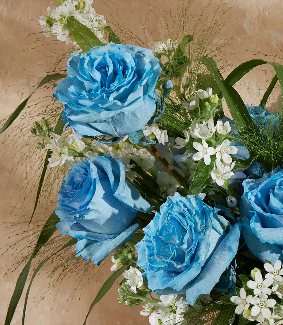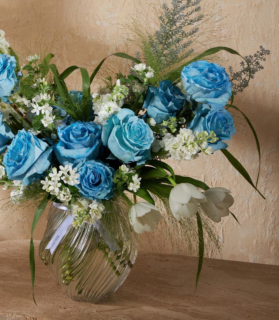 Blue Radiance Rose Vase Arrangement A luxurious vase of exclusive tinted blue roses from Ecuador, paired with premium white tulips, stock, and airy greenery for a timeless elegance.