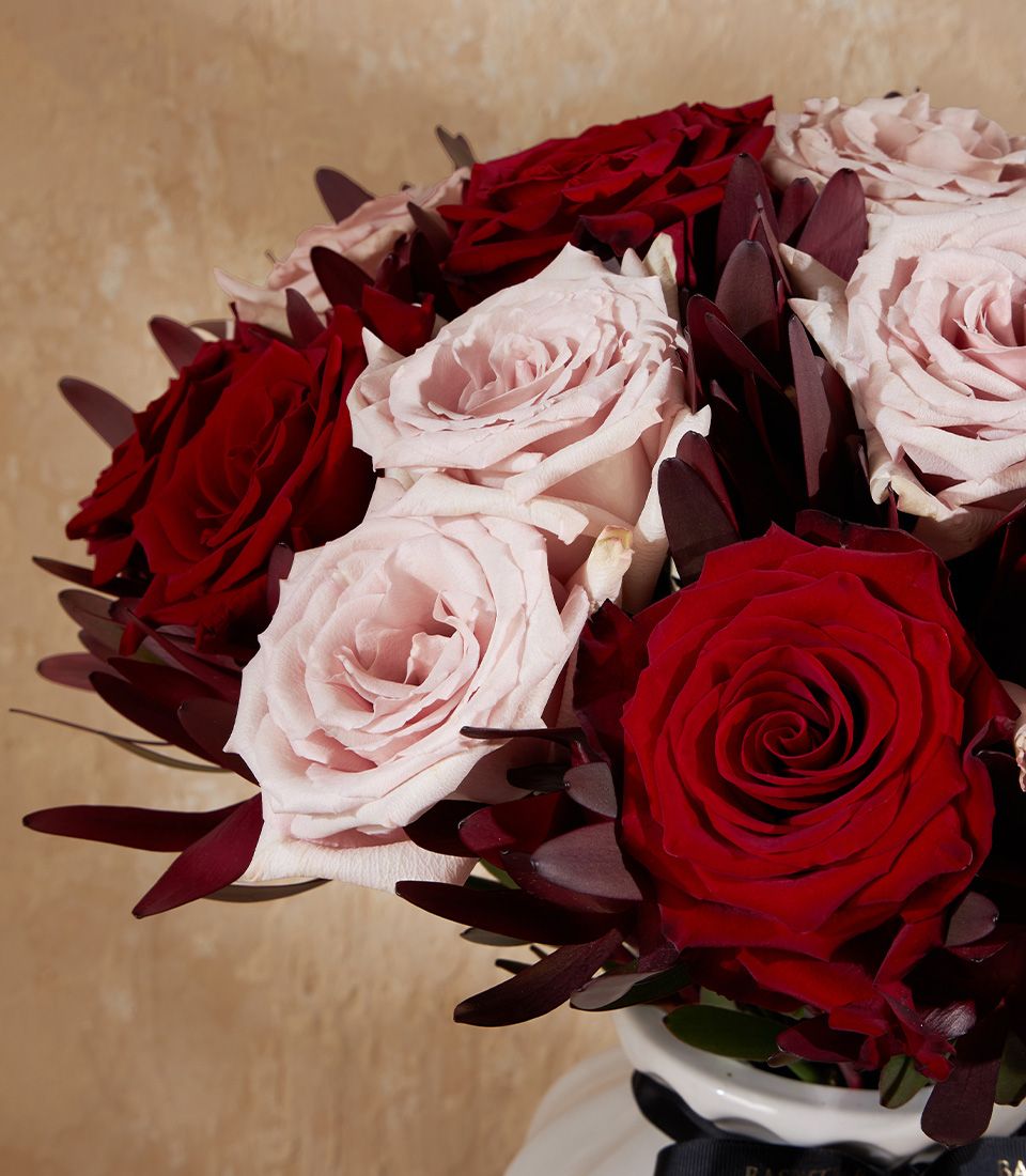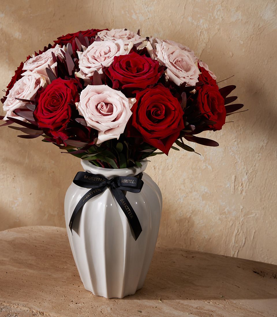 Elegant vase of red and blush roses, combining passion with soft romance. A luxury floral gift for anniversaries, proposals, or stylish décor.