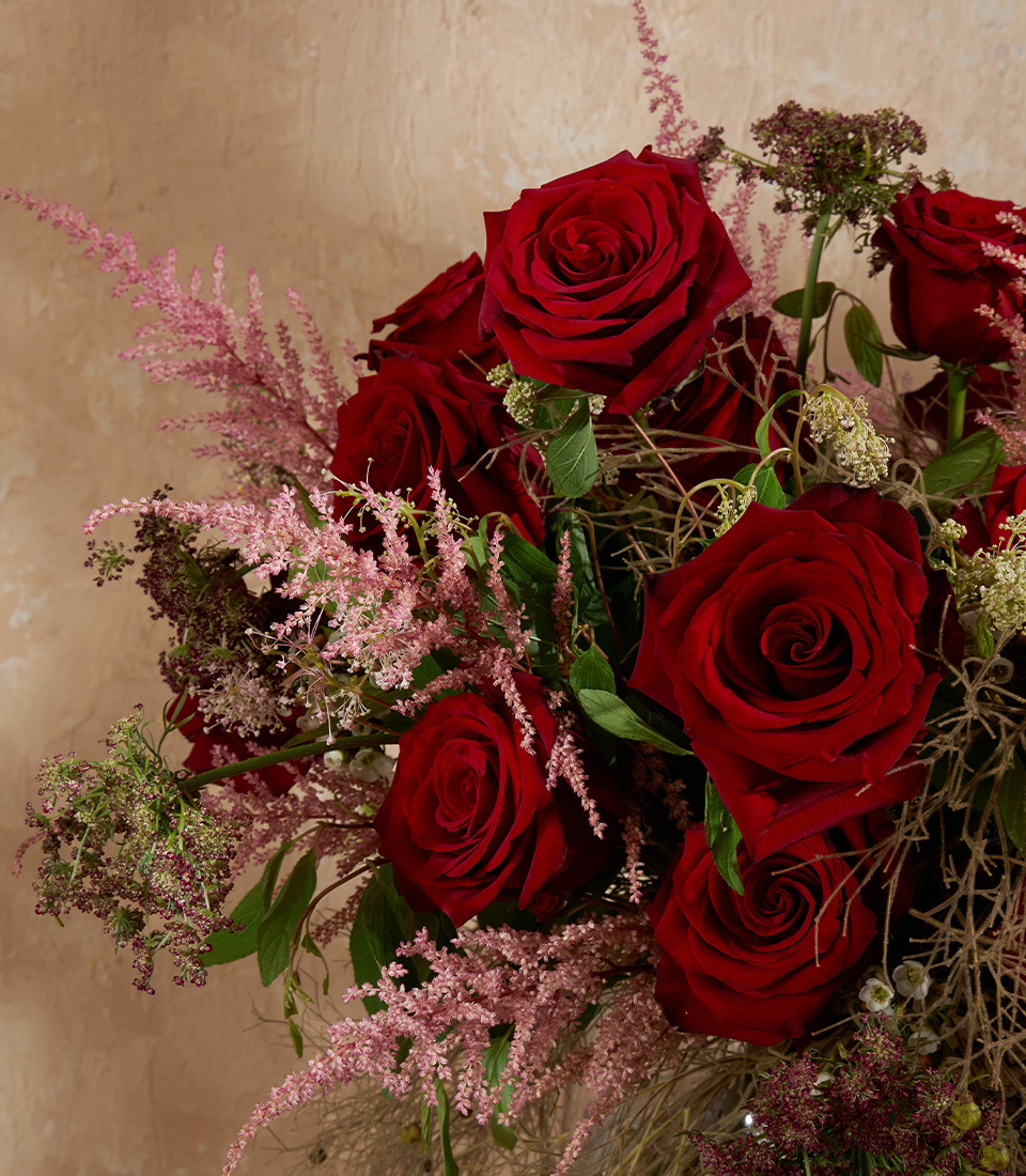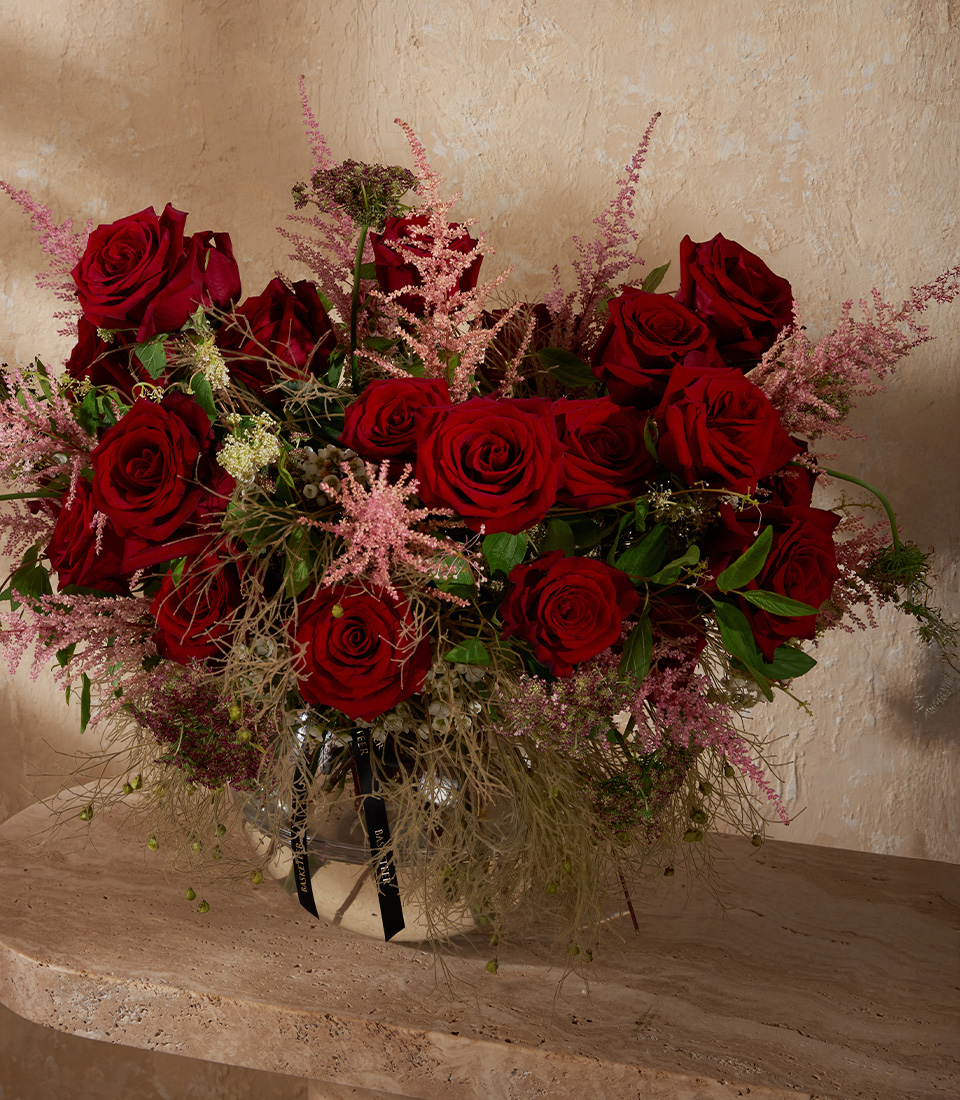Luxurious red rose vase with imported Explorer roses, astilbe, and waxflower. A bold floral gift for romance or statement décor.