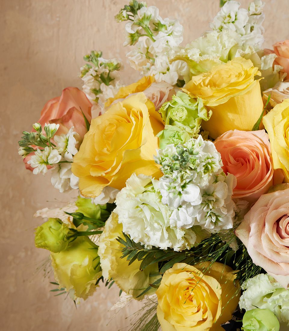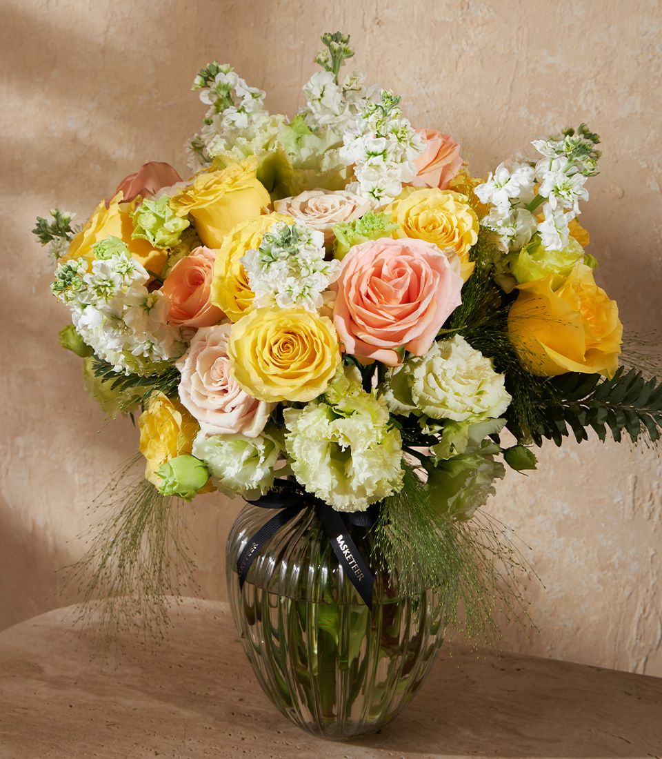 Elegant Sunrise Vase Arrangement This radiant vase arrangement features premium imported roses in golden yellow, peach, and soft blush tones. Accented with fresh whites and airy greens, it brings warmth, joy, and effortless elegance to any occasion or space.