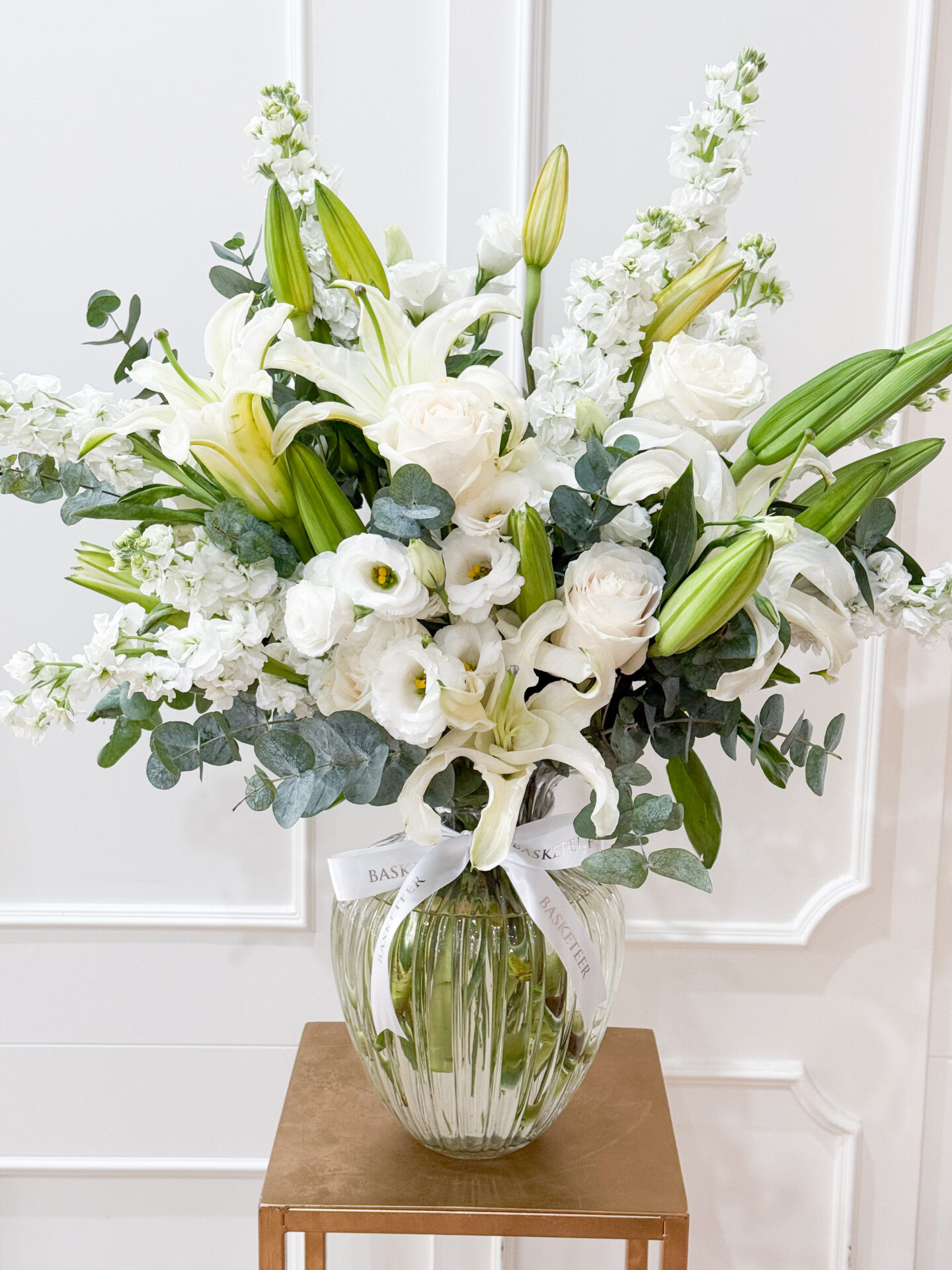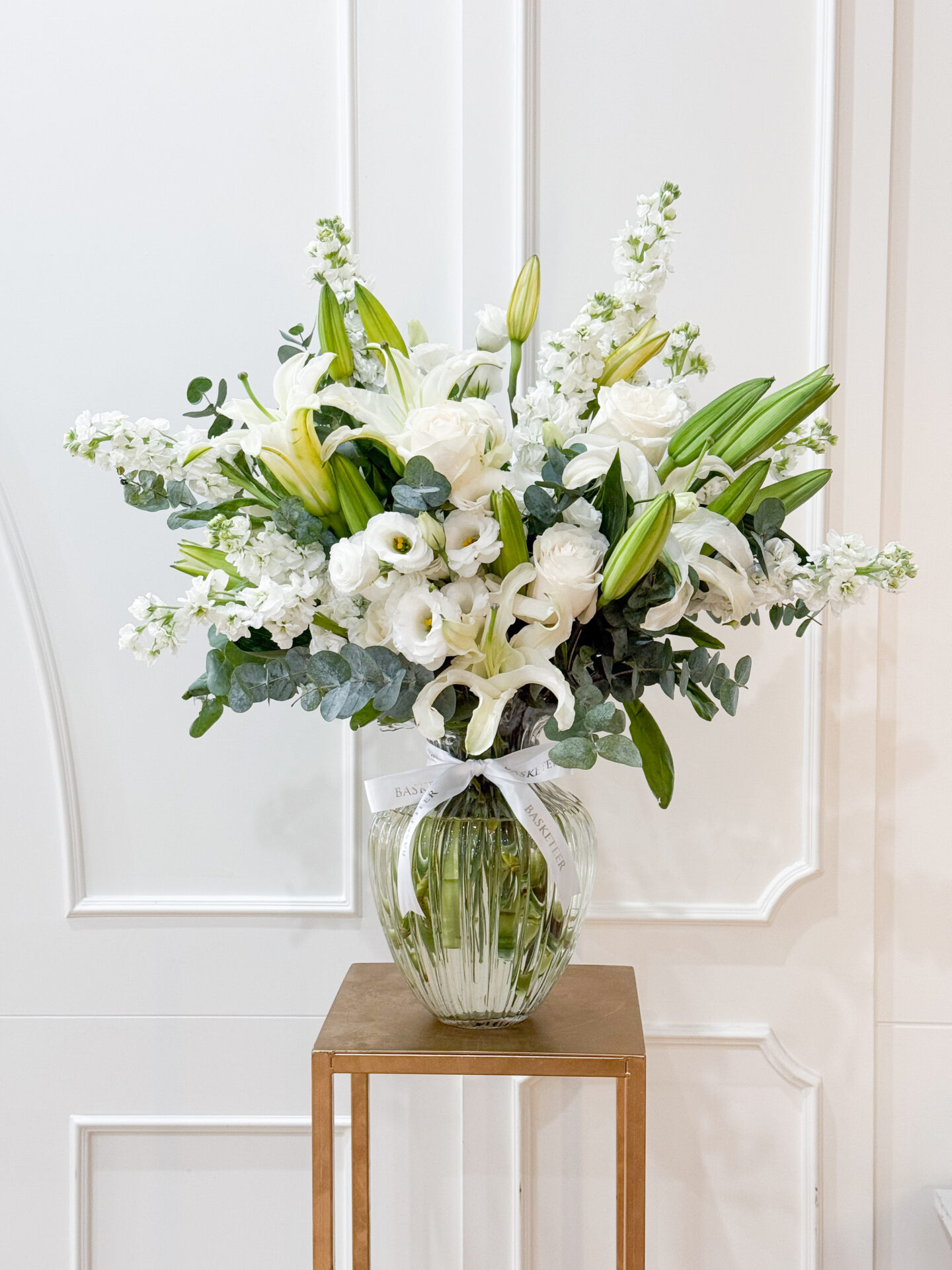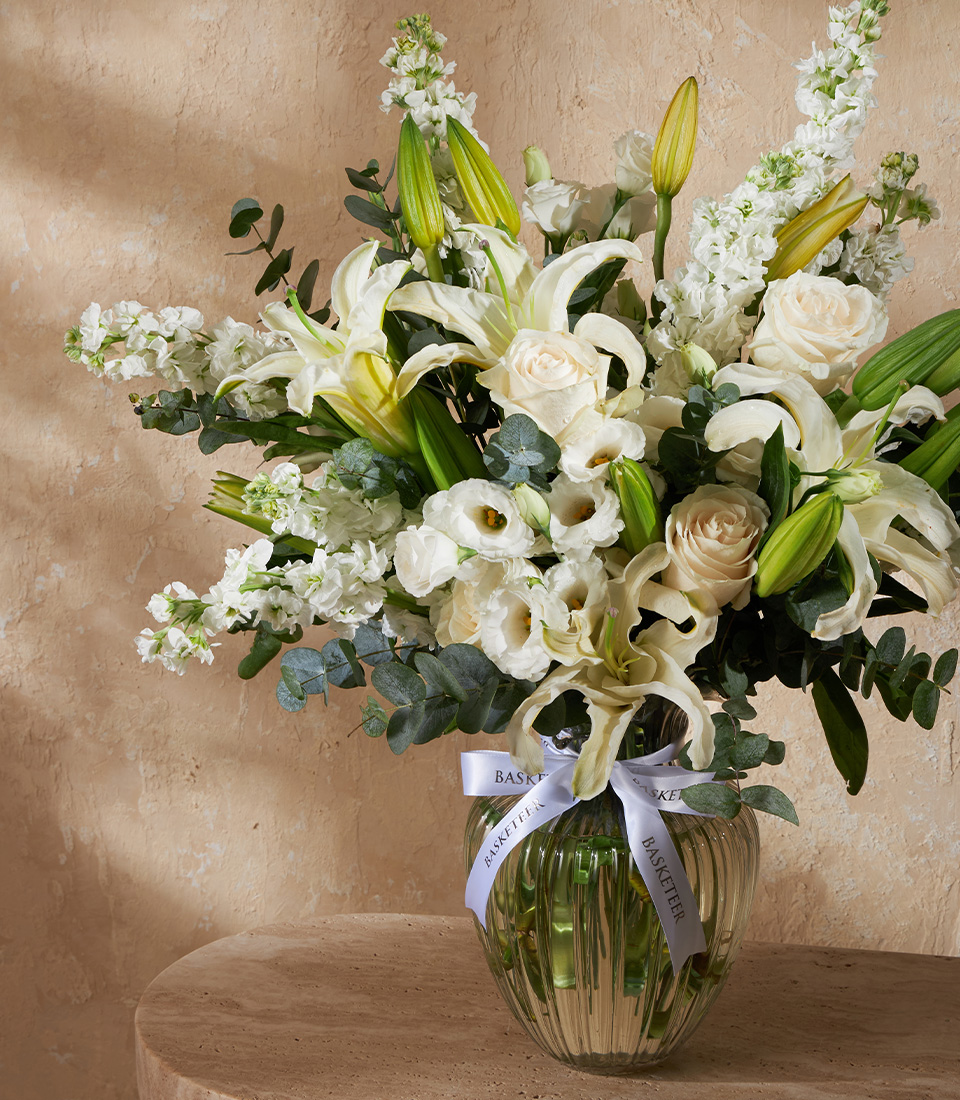 Elegant White Lily Vase A graceful vase arrangement of premium white lilies, lisianthus, and stock with fresh eucalyptus. Perfect for timeless elegance and refined interiors.