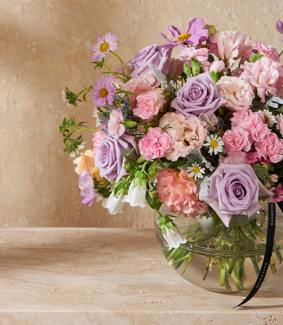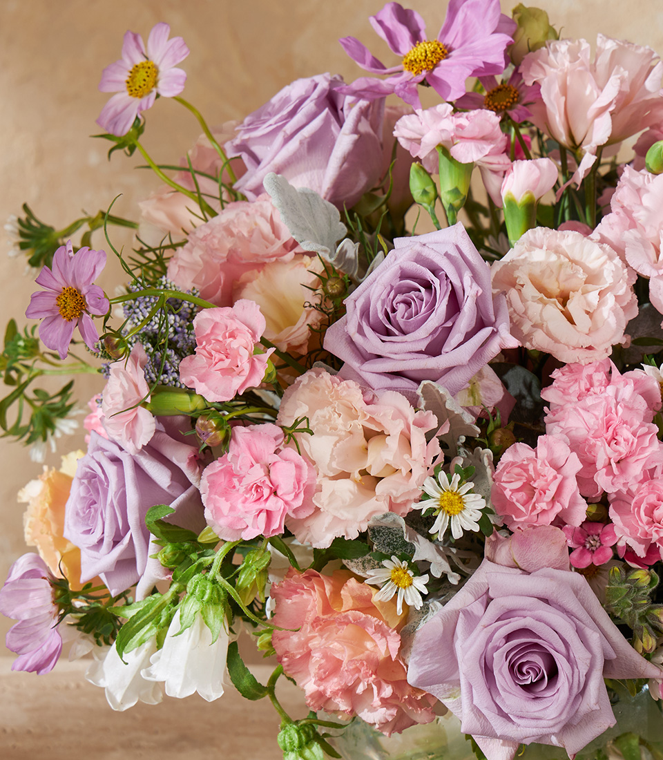 Elegant vase with purple roses, pink carnations, lisianthus, and cosmos. A soft pastel flower arrangement perfect for birthdays, anniversaries, and celebrations in Bangkok.