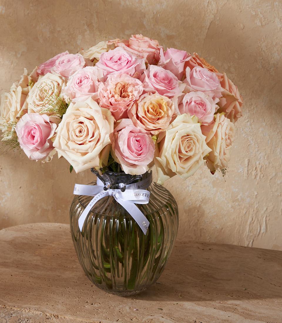 Eternal Blush Harmony Vase An exquisite vase featuring Nena, Sahara, and Phoenix Phone Roses from Ecuador. Soft blush, peach, and cream hues create a refined, timeless elegance.