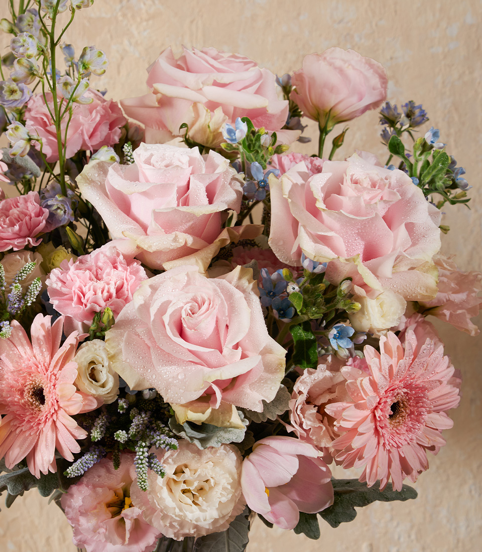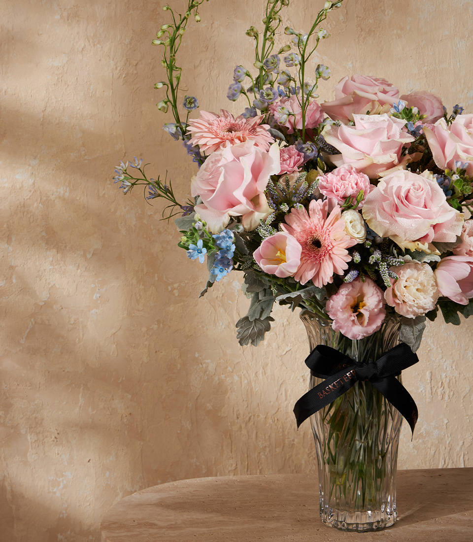 Elegant vase of pink roses, gerberas, tulips, and carnations, accented with blue blooms. A luxury pastel flower arrangement in Bangkok.