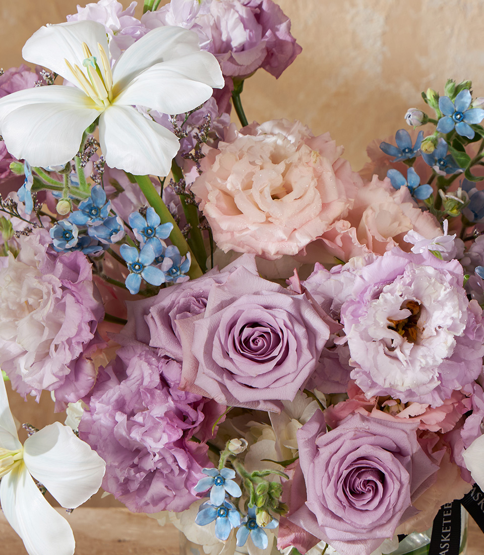 Elegant vase with lavender roses, white lilies, and blue accents. Perfect floral arrangement for birthdays, anniversaries, or special celebrations in Bangkok.