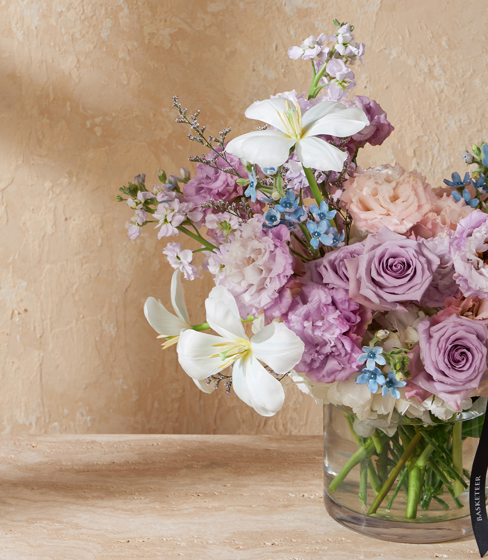 Ethereal Lavender Vase Featuring premium Ocean Song Roses, white tulips, and purple lisianthus, this elegant vase radiates timeless lavender charm for any celebration.