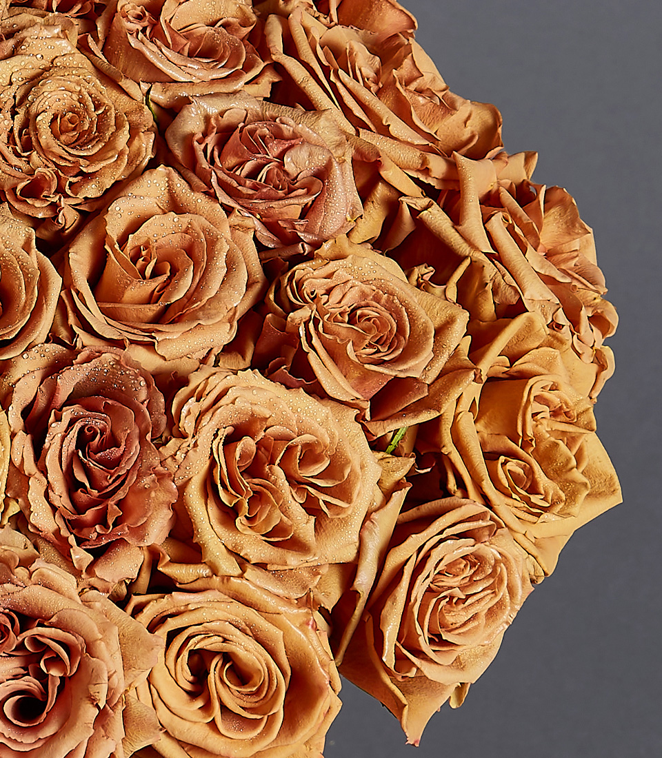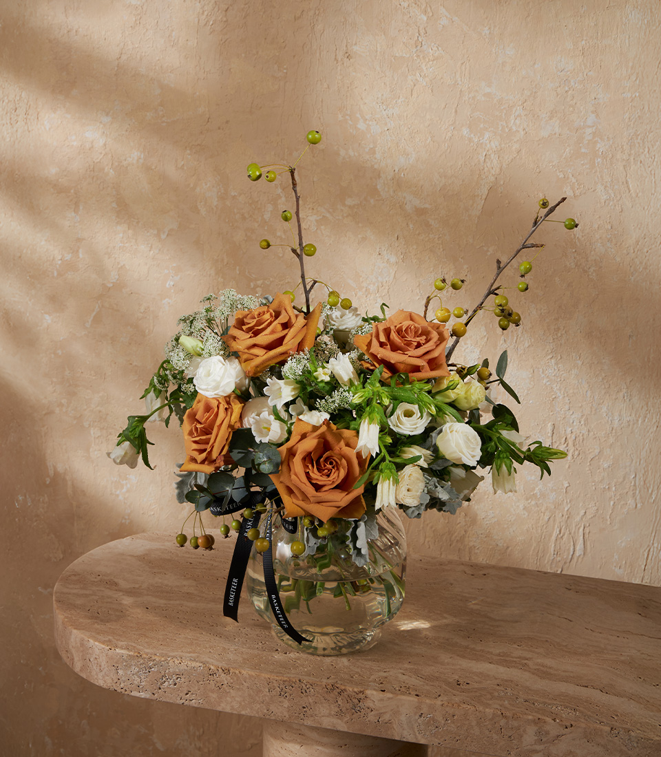 Golden Charm Vase Arrangement A graceful vase arrangement featuring Toffee Roses imported from Ecuador, radiating warmth and elegance—perfect for luxury gifting and special occasions.