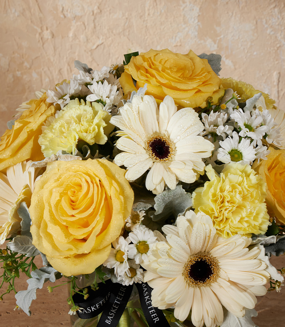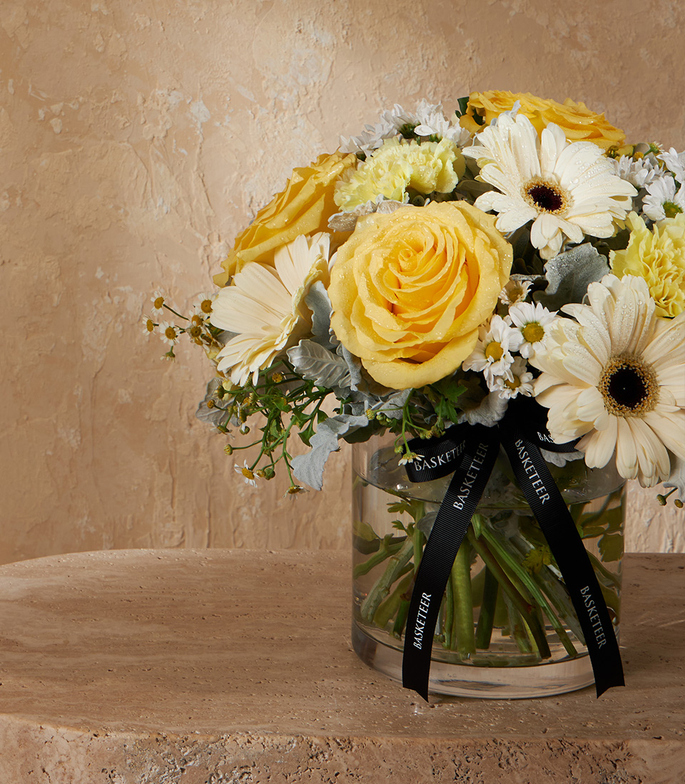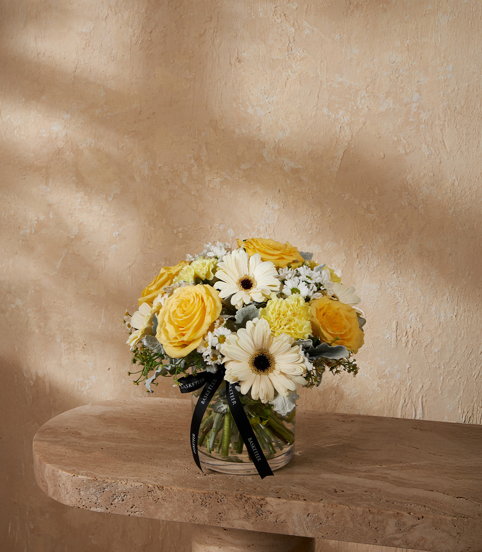 Golden Charm Vase Arrangement A cheerful mini vase featuring Cubana Roses, paired with gerbera and carnations in sunny yellow and white tones, bringing warmth and joy to any space.