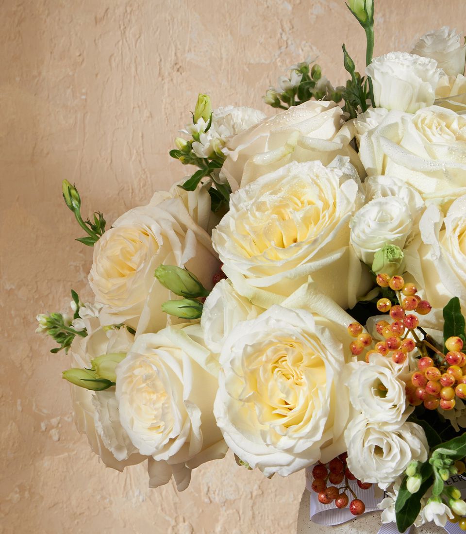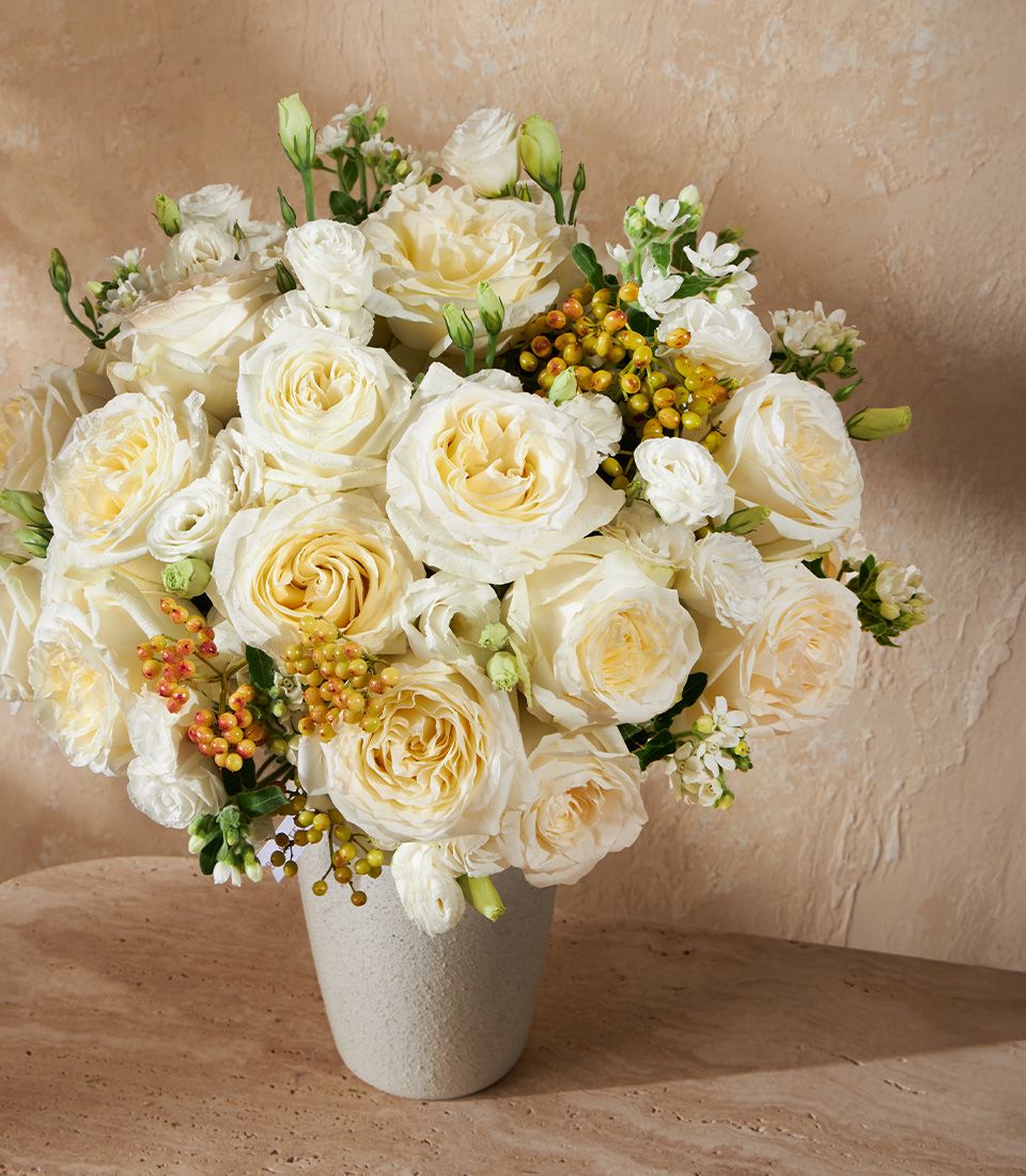 Golden Glow Vase Arrangement This radiant vase features imported Candlelight roses in soft buttery tones, paired with crisp whites and vibrant textures. A timeless and uplifting floral piece for elegant settings or heartfelt gifting.