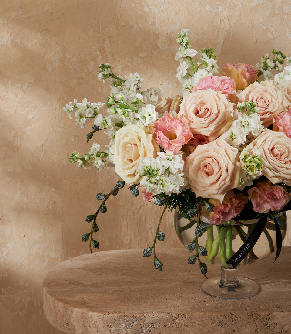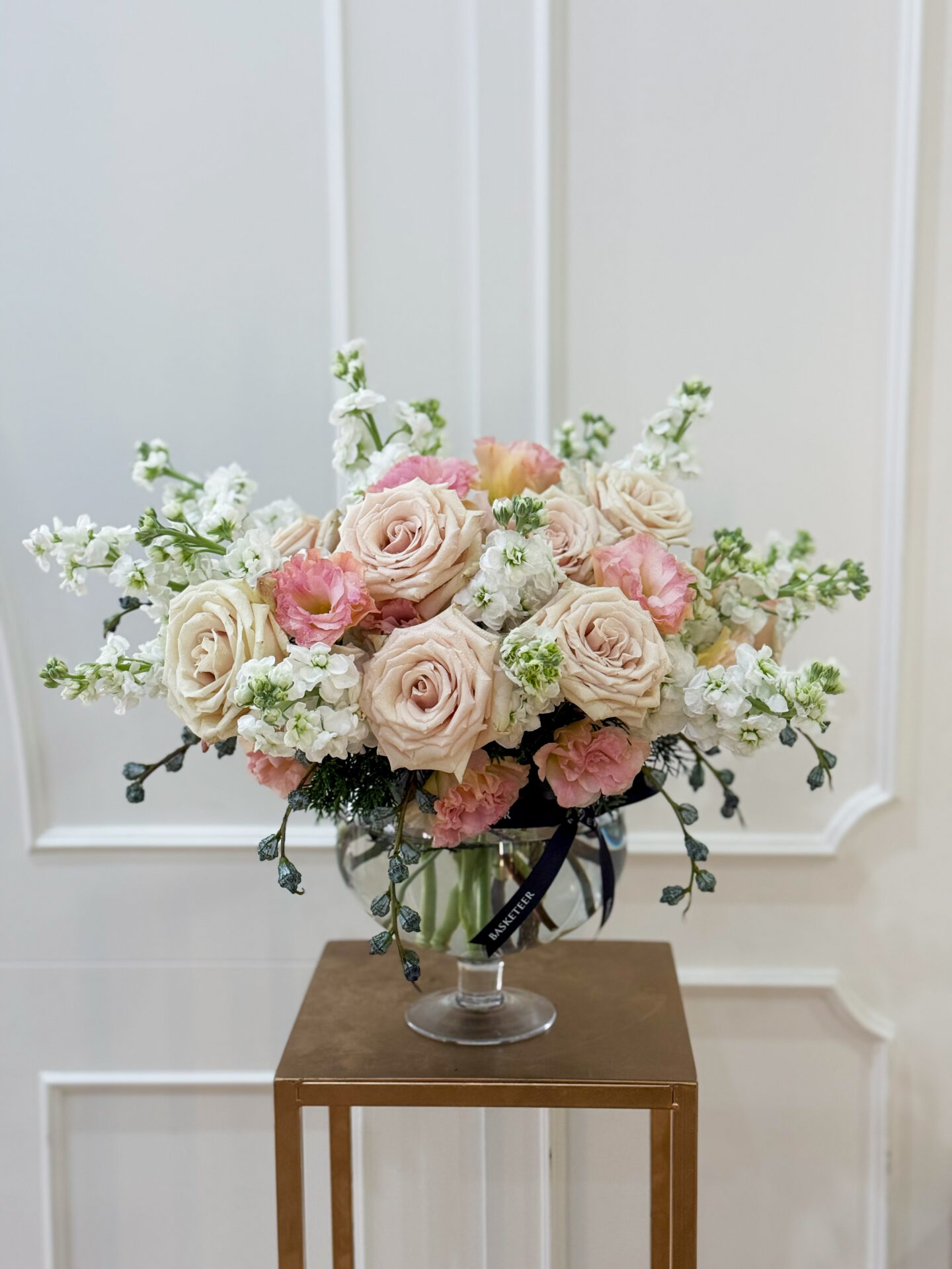 Order a pastel compote vase with cream and pink roses and white stock. Perfect for elegant occasions with premium flower delivery in Bangkok.