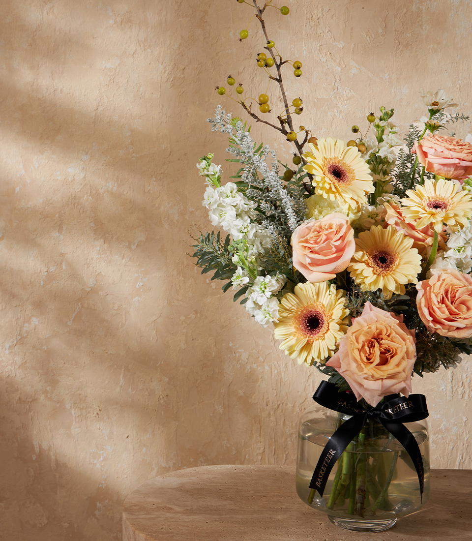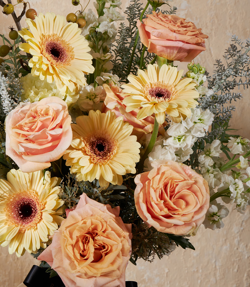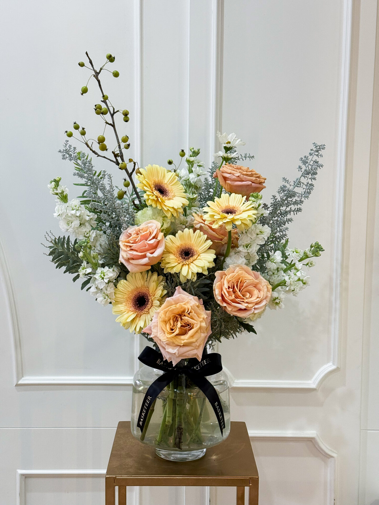 Vase arrangement with peach roses, yellow gerberas, and white stock, accented by greenery. Perfect for warm, elegant gifting.