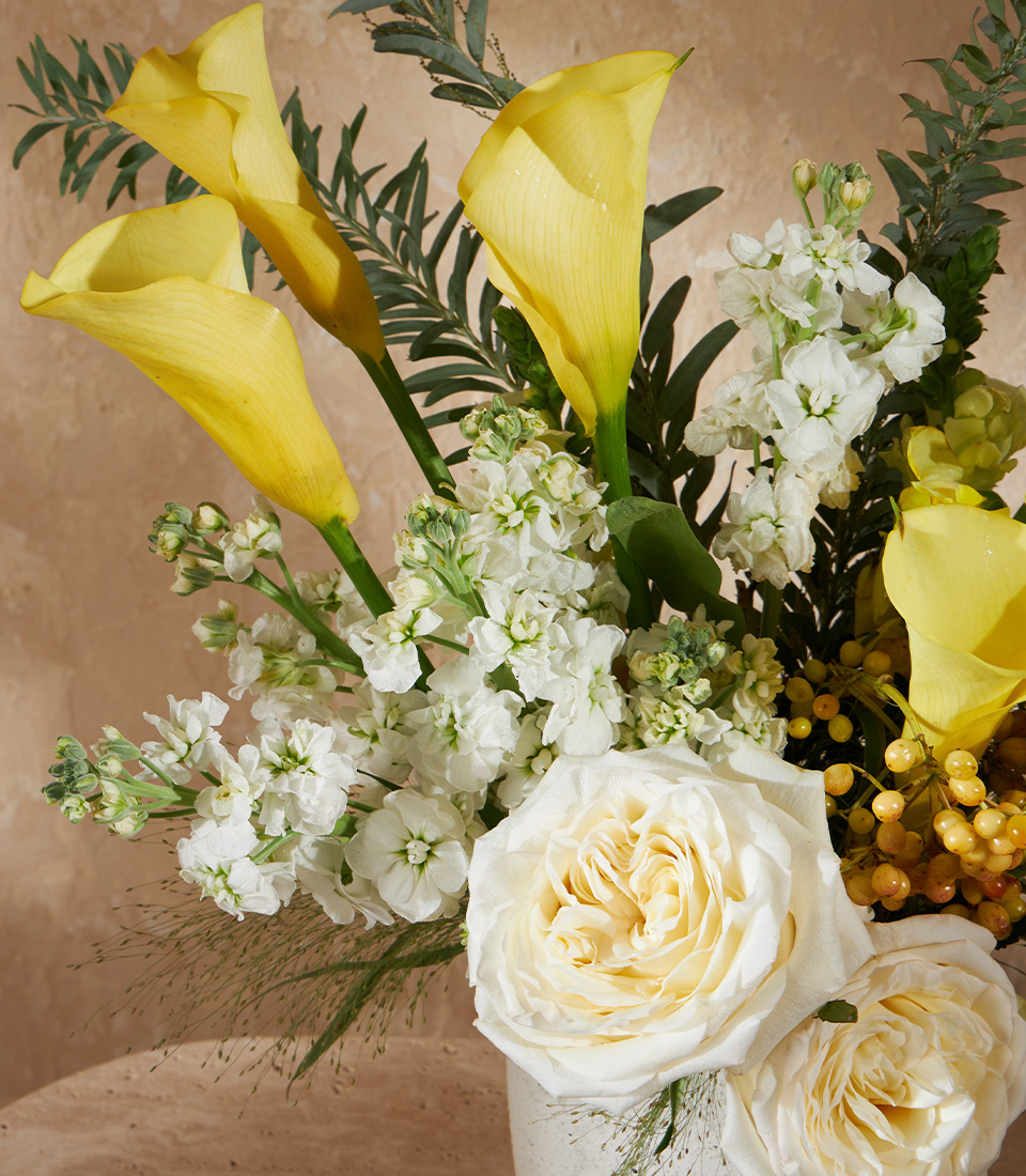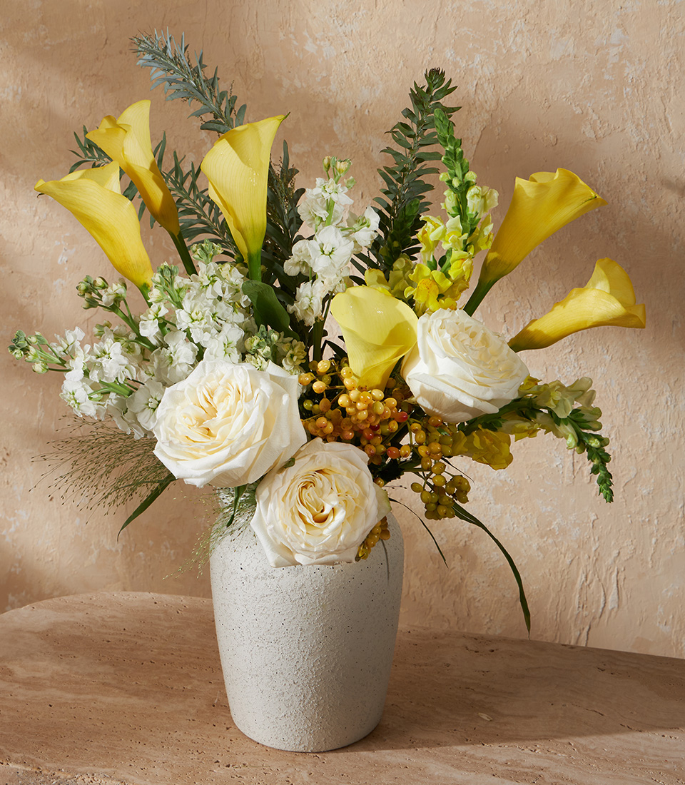 Cheerful vase bouquet with yellow calla lilies and white roses in a stone vase. Perfect for joyful gifts with Bangkok flower delivery.