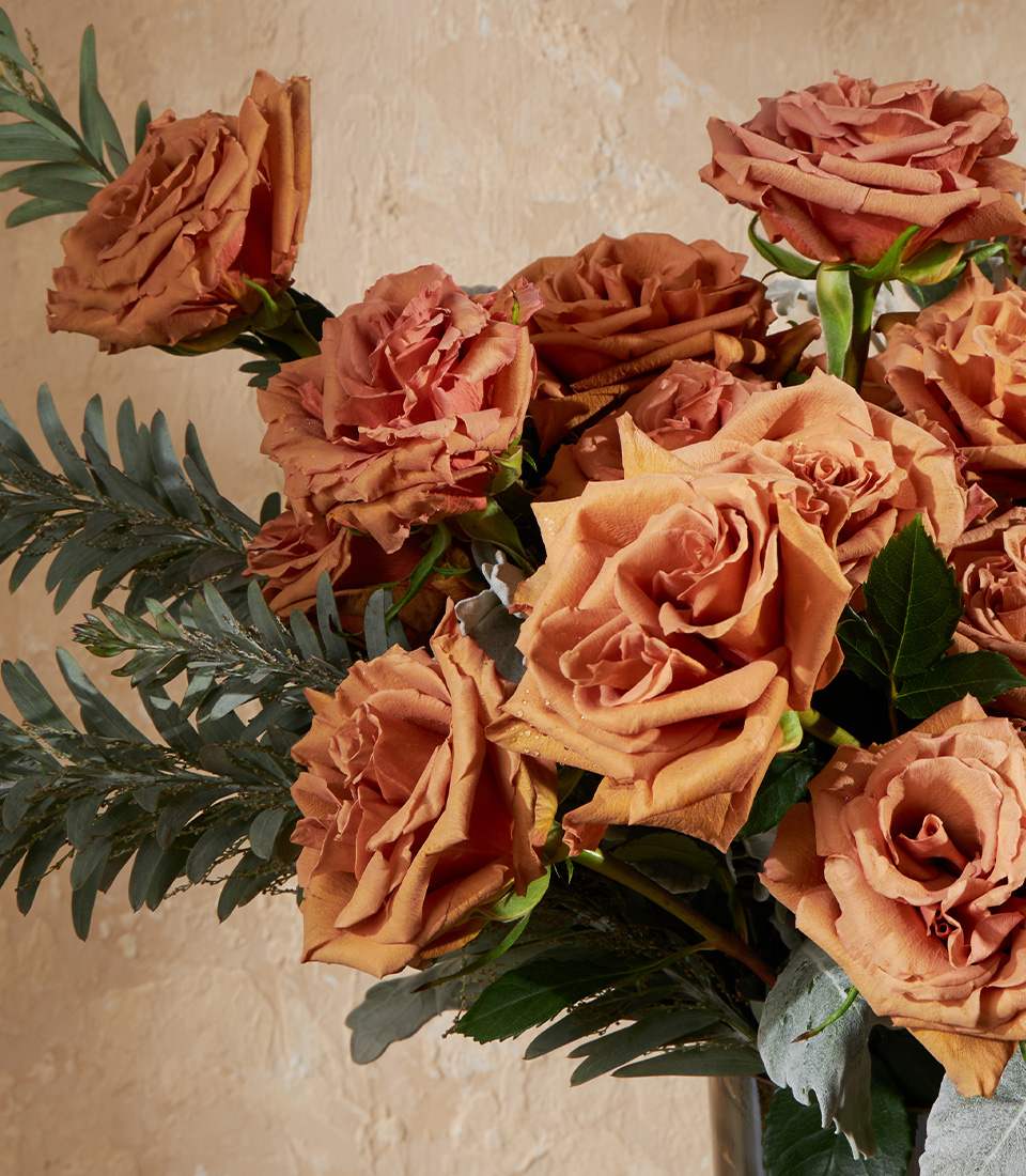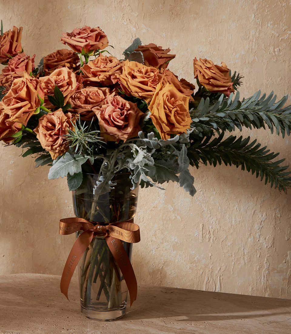 Golden Toffee Elegance Vase A luxurious vase of exclusive Toffee Roses from Ecuador, accented with silver leaves and textured greenery. Perfect for elegant gifting and modern interiors.