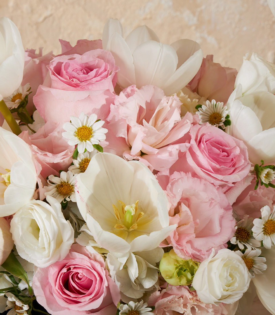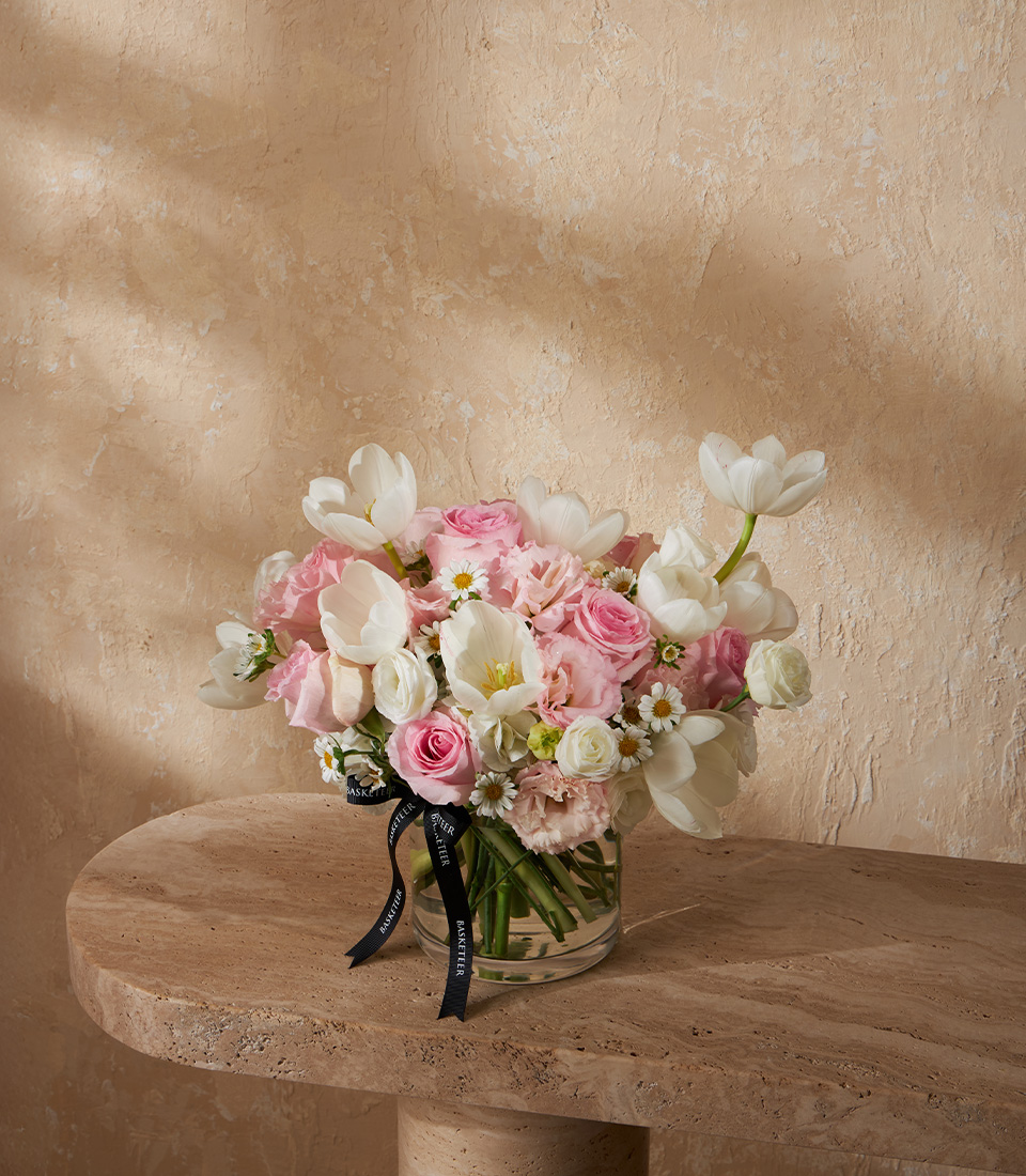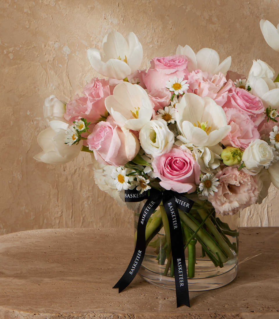 Charming vase with white tulips pink roses and daisies A soft pastel flower gift perfect for Bangkok delivery with premium design and service