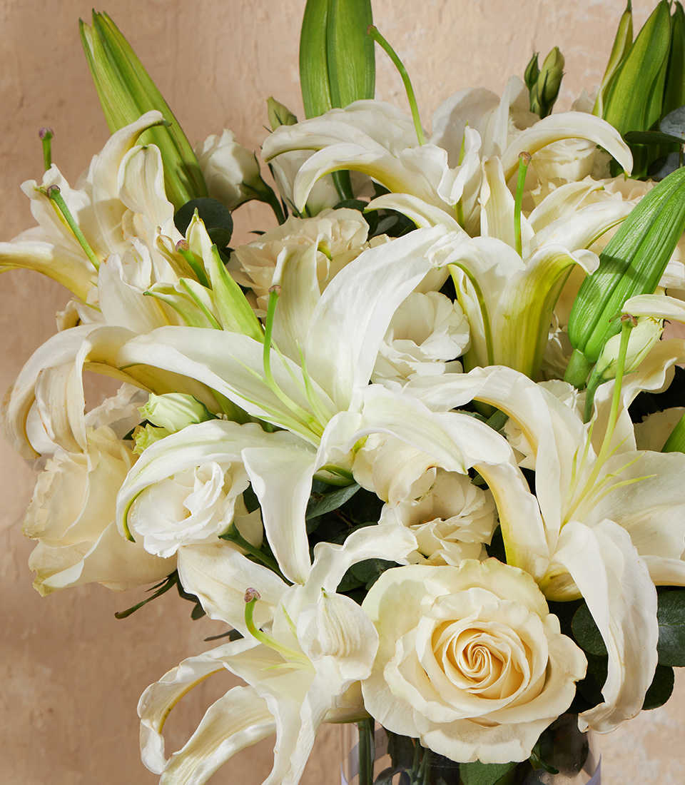Graceful Purity Vase Arrangement A refined vase of Mondial Roses from Ecuador, paired with premium white lilies and lisianthus, styled with elegance for weddings and anniversaries.