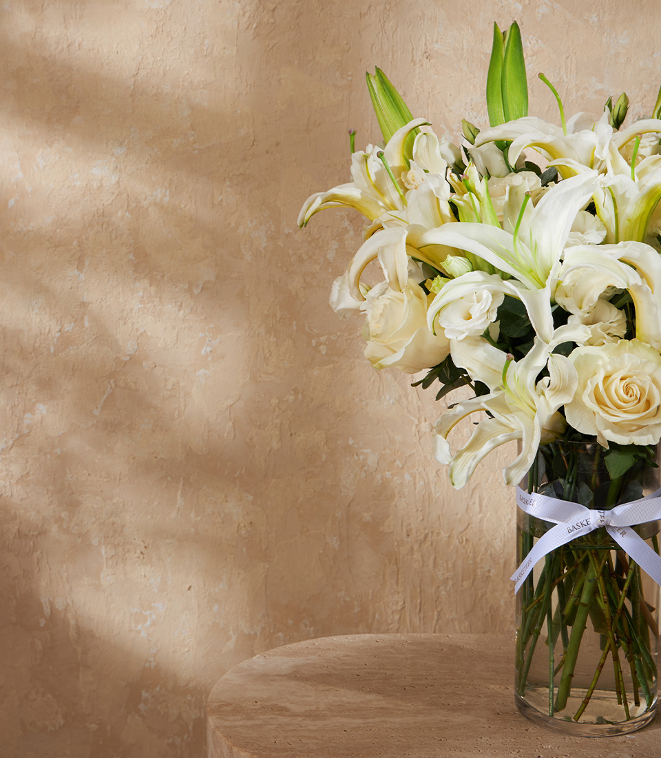 Elegant vase with white lilies and roses, accented with greenery. A premium flower gift in Bangkok for anniversaries and luxury spaces.