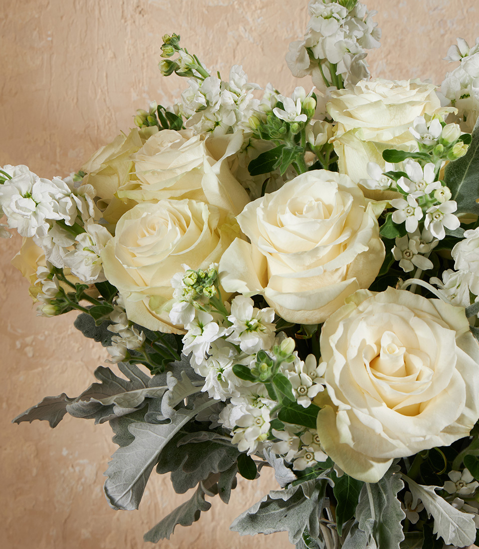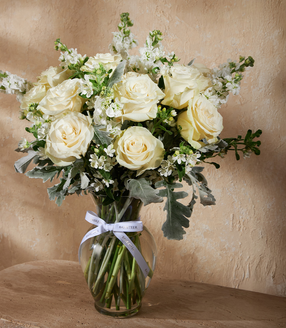 Elegant vase with premium white roses and soft greenery. A timeless floral gift ideal for weddings, engagements, sympathy, or elegant interiors.