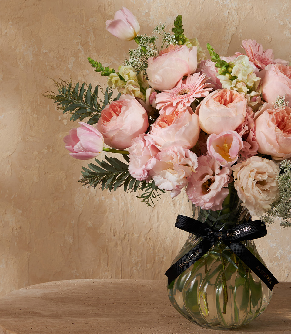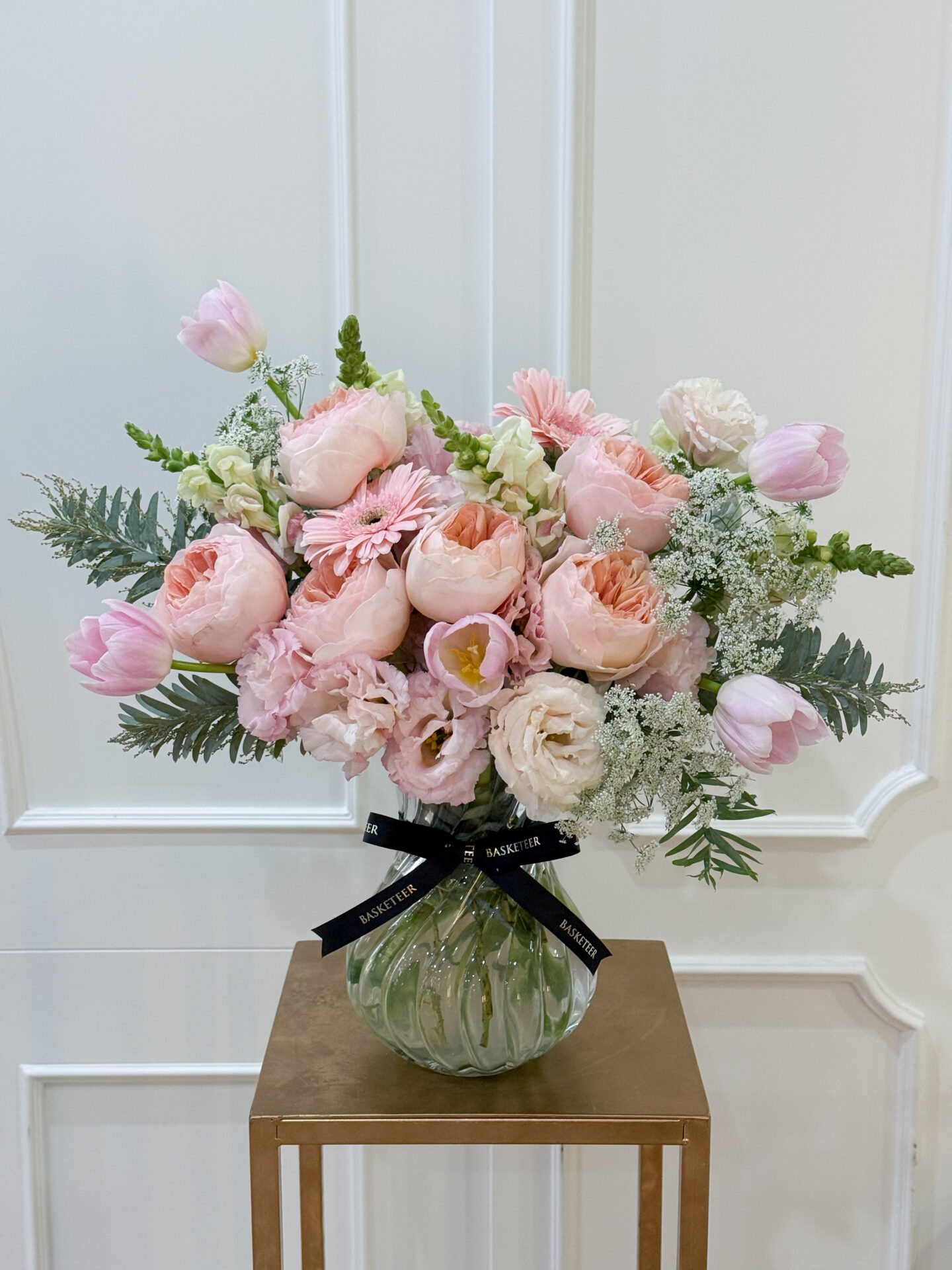 Vase with pink garden roses, tulips, and pastel blooms, styled with greenery. Ideal for weddings, anniversaries, and romantic gifts.